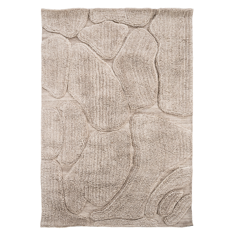 Een royaal handgetuft vloerkleed met een natuurlijk dessin in warme taupetinten. Het lage poolwerk blijft stijlvol en onderhoudsvriendelijk, terwijl de reliëfvlakken textuur en diepte toevoegen.