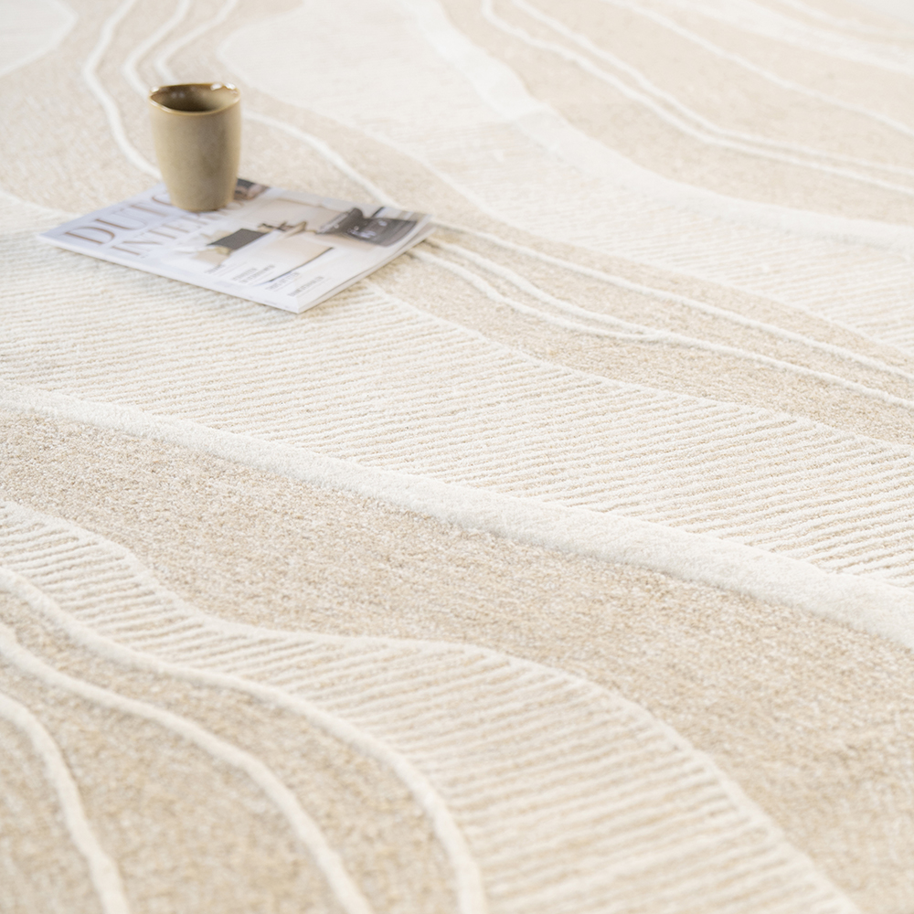 Een prachtig handgetuft vloerkleed waarbij organische, golvende lijnen samenkomen in een zacht beige palet. De “Soil” voegt textuur en dynamiek toe aan elk interieur, zonder de harmonie te verstoren.