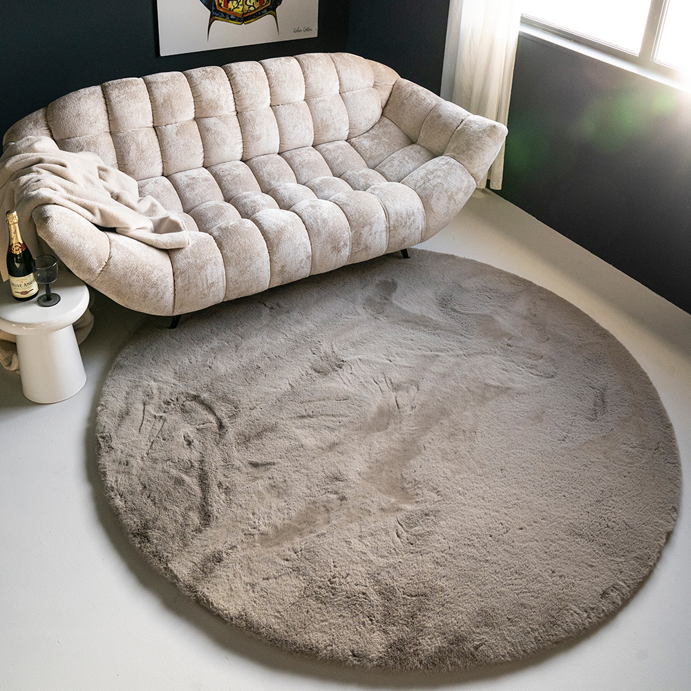 Korte omschrijving Zacht rond vloerkleed met luxe glans en gemêleerd oppervlak. Perfect voor een elegante, rustige sfeer in je interieur.