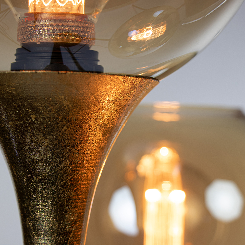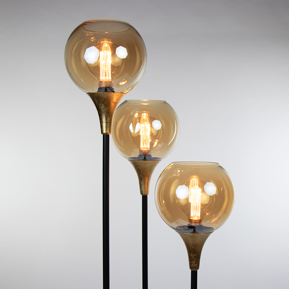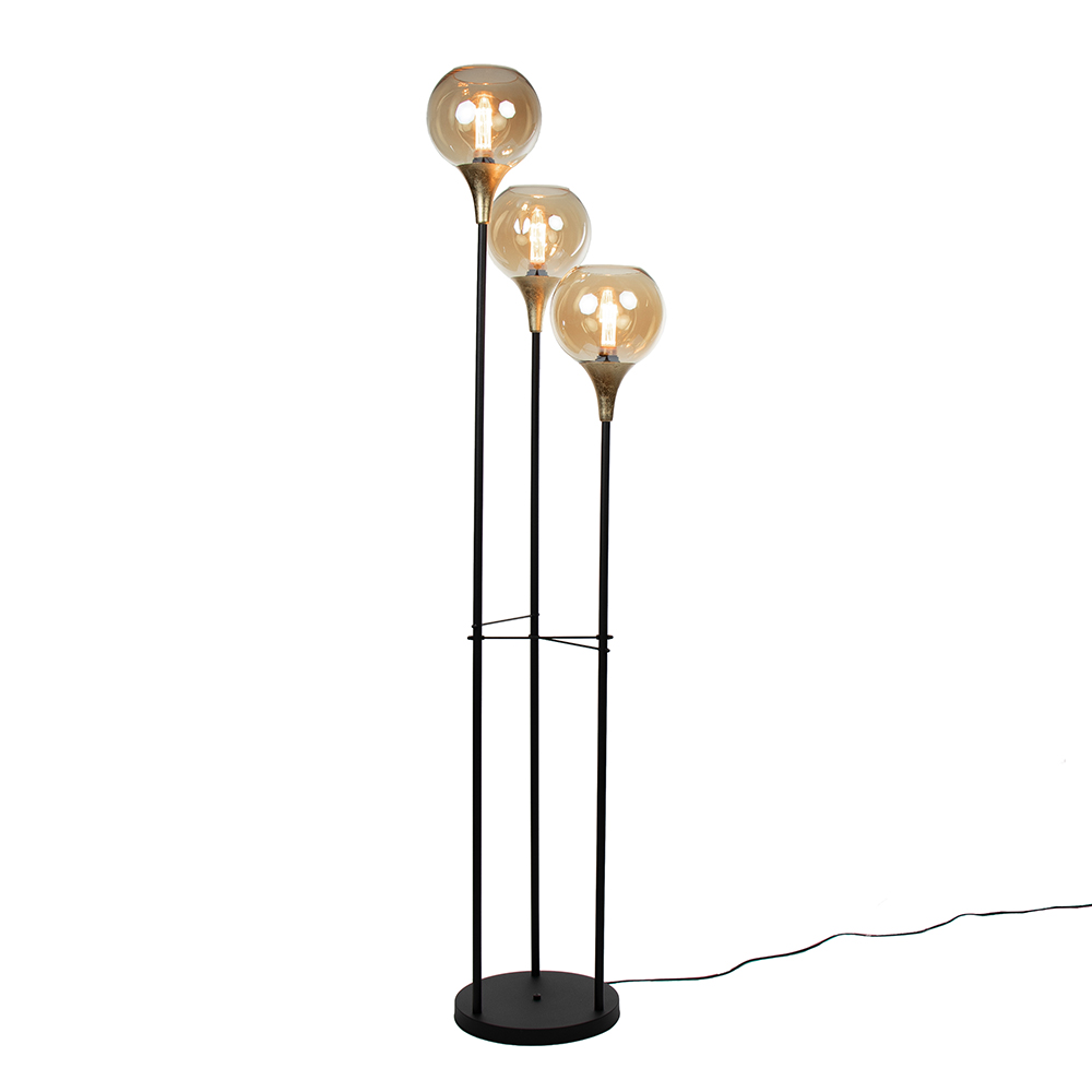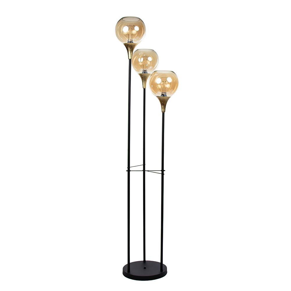 Deze sfeermaker is een mooie toevoeging aan het interieur. Het armatuur is uitgevoerd in het zwart met een gouden detail. Het goud heeft een bladgoud look wat de lamp een extra chique uitstraling geeft. Dit is mooi gecombineerd met een amber glazen bol die zorgt voor een warme uitstraling. De vloerlamp is voorzien van een zwart snoer met een lengte van 230 cm, met een schakelaar op 175cm.