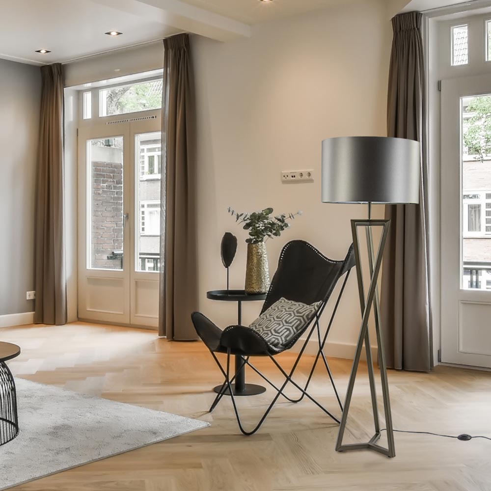 Een prachtig design dat prima geschikt is voor diverse woonstijlen. De vloerlamp is gemaakt van metaal en voorzien van een platinum finish. Dit geeft de staande lamp een robuuste uitstraling. Door de lampvoet te combineren met een kap naar wens kunt u de lamp helemaal eigen maken. De kap is dan ook medebepalend voor de uitstraling van de lamp. Het kruislingse armatuur heeft een strak ontwerp en is voorzien van een snoer met vloerdimmer.