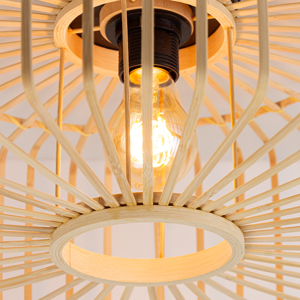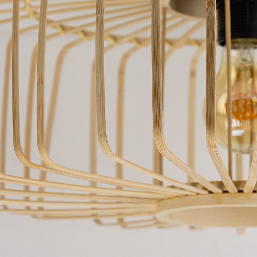 Deze vloerlamp combineert natuurlijke charme met modern gebruiksgemak. De zwarte metalen basis en zwenkarm vormen een stijlvol contrast met de opengewerkte kap van naturel bamboe. De speelse vorm van de arm zorgt niet alleen voor een eigentijdse look, maar maakt het ook mogelijk om het licht precies te richten waar jij het nodig hebt – ideaal naast de bank of een leeshoek. De kap van fijn gevlochten hout zorgt voor een warme lichtverspreiding en brengt meteen sfeer in huis. Perfect te combineren met een decoratieve filamentlamp voor een extra stijlvol effect.