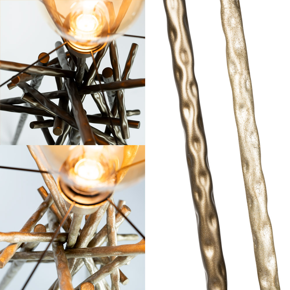 • Unieke ‘Brut’ lampenserie met organisch, speels design • Verkrijgbaar als hanglamp, vloerlamp en tafellamp • Keuze uit brons en ambachtelijk zilver • Handgemaakt karakter met takkenstructuur van metaal • Perfect voor hotel chique, boho en whimsical interieurs • Sfeervolle combinatie van design en warme verlichting