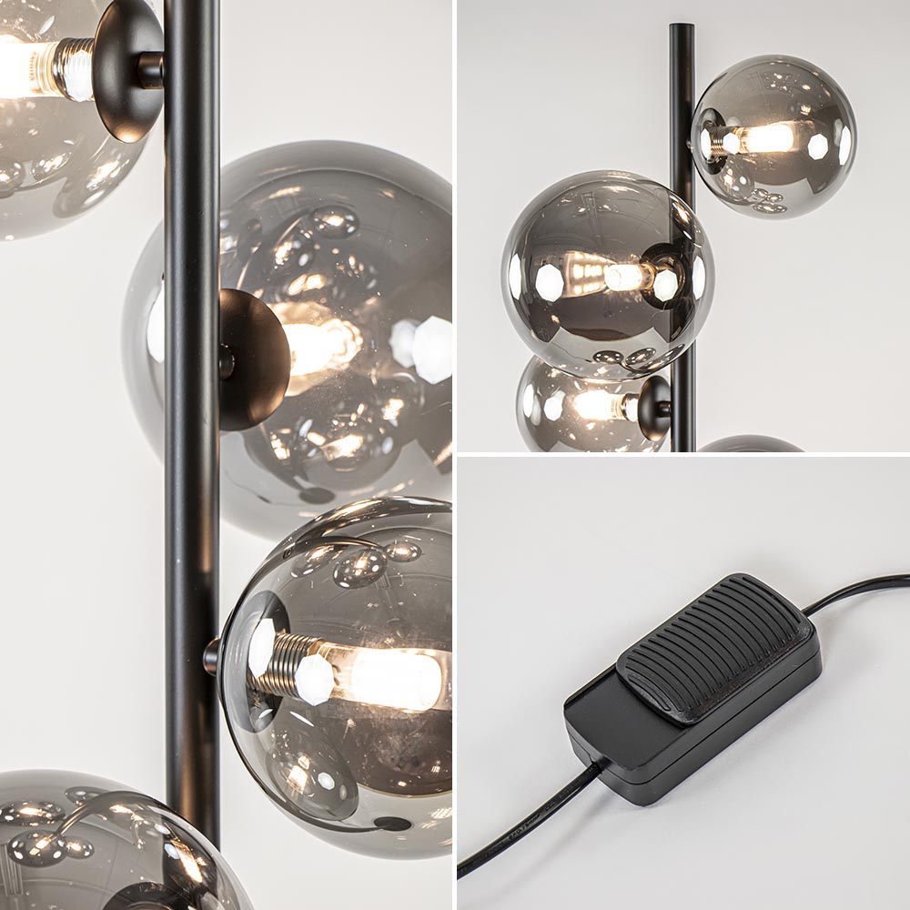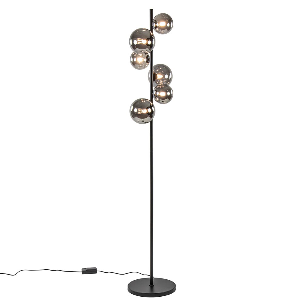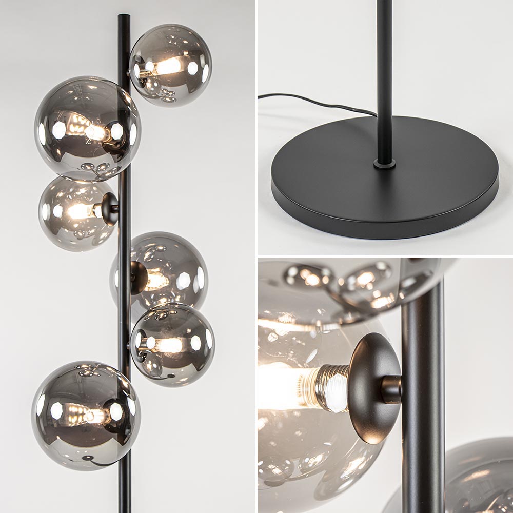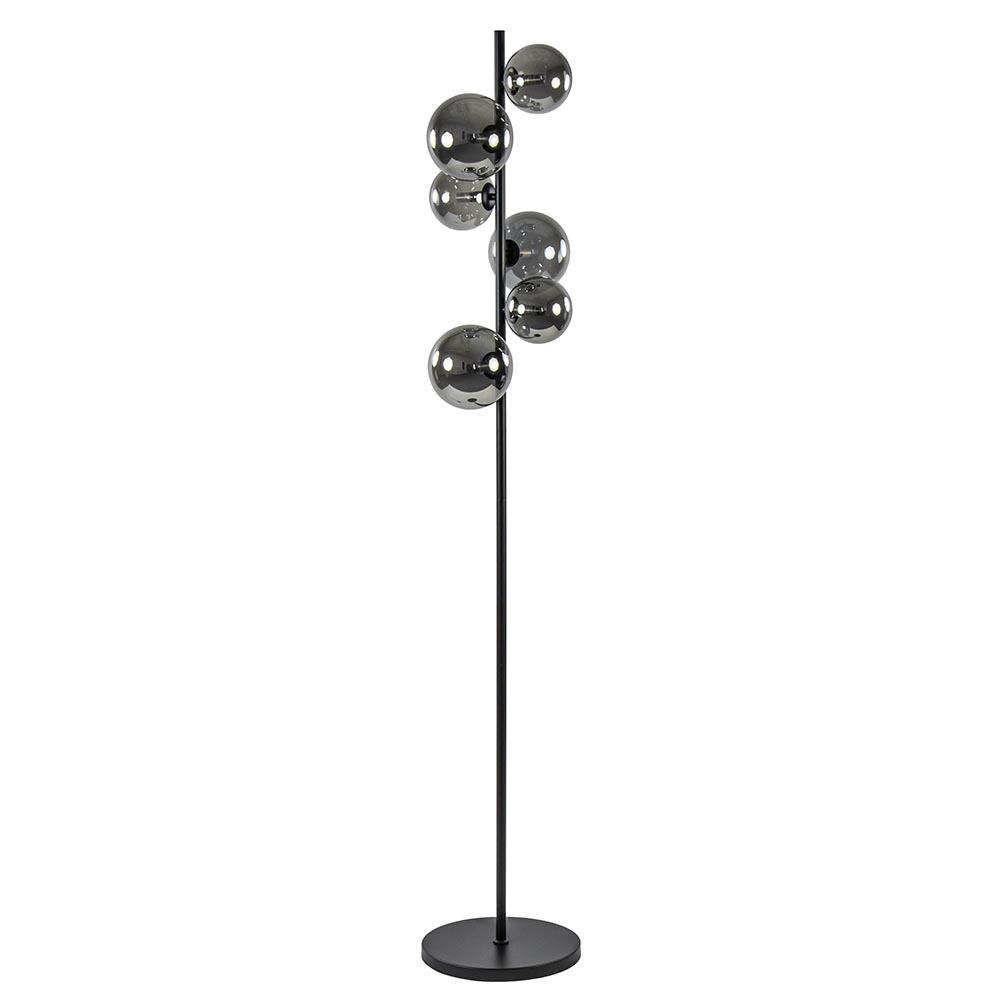 Deze prachtige vloerlamp past helemaal bij de huidige woontrends. De staande lamp heeft een retro / Art Deco uitstraling die nu ook veel terug te vinden is in het interieur. De vloerlamp heeft een metalen armatuur dat is uitgevoerd in het mat zwart. Over het armatuur zijn aan de bovenzijde 6 smoke glazen bollen verdeeld. Deze hebben een afmeting van 12 en 15 cm doorsnede. De afwisseling van het glas maakt de lamp helemaal compleet en zorgt dat ze lamp vanuit iedere hoek een mooi exemplaar is. De retro vloerlamp is voorzien van een zwart snoer met een lengte van 210 cm. In het snoer is een dimmer verwerkt zodat u gemakkelijk kunt wisselen van sfeer.