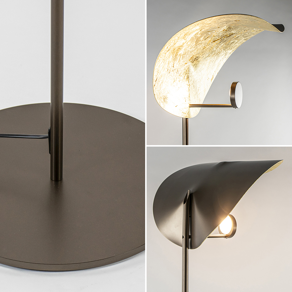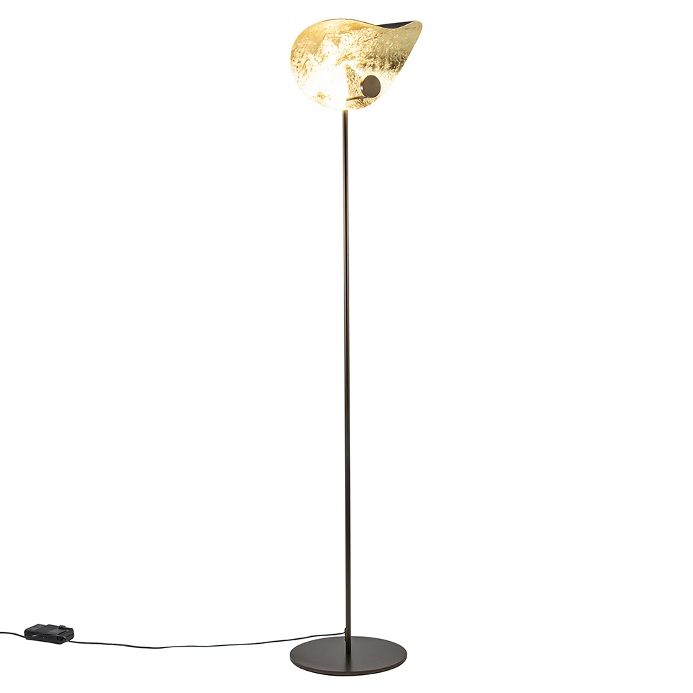 Deze prachtige design vloerlamp maakt een mooi statement in uw woning. De LED vloerlamp is van Italiaans design en straalt dan ook een en al luxe en elegantie uit. De staande lamp is gemaakt van metaal en uitgevoerd in brons met goldleaf. Dit geeft de vloerlamp een extra chique uitstraling. De LED lichtbron bevindt zich voor de kap en zorgt zo voor een sfeervolle indirecte verlichting welke ook dimbaar is middels de dimmer in het snoer. Door de gouden binnenzijde van de kap wordt het licht prachtig weerkaatst en zorgt deze ook voor een warme gloed in het interieur.