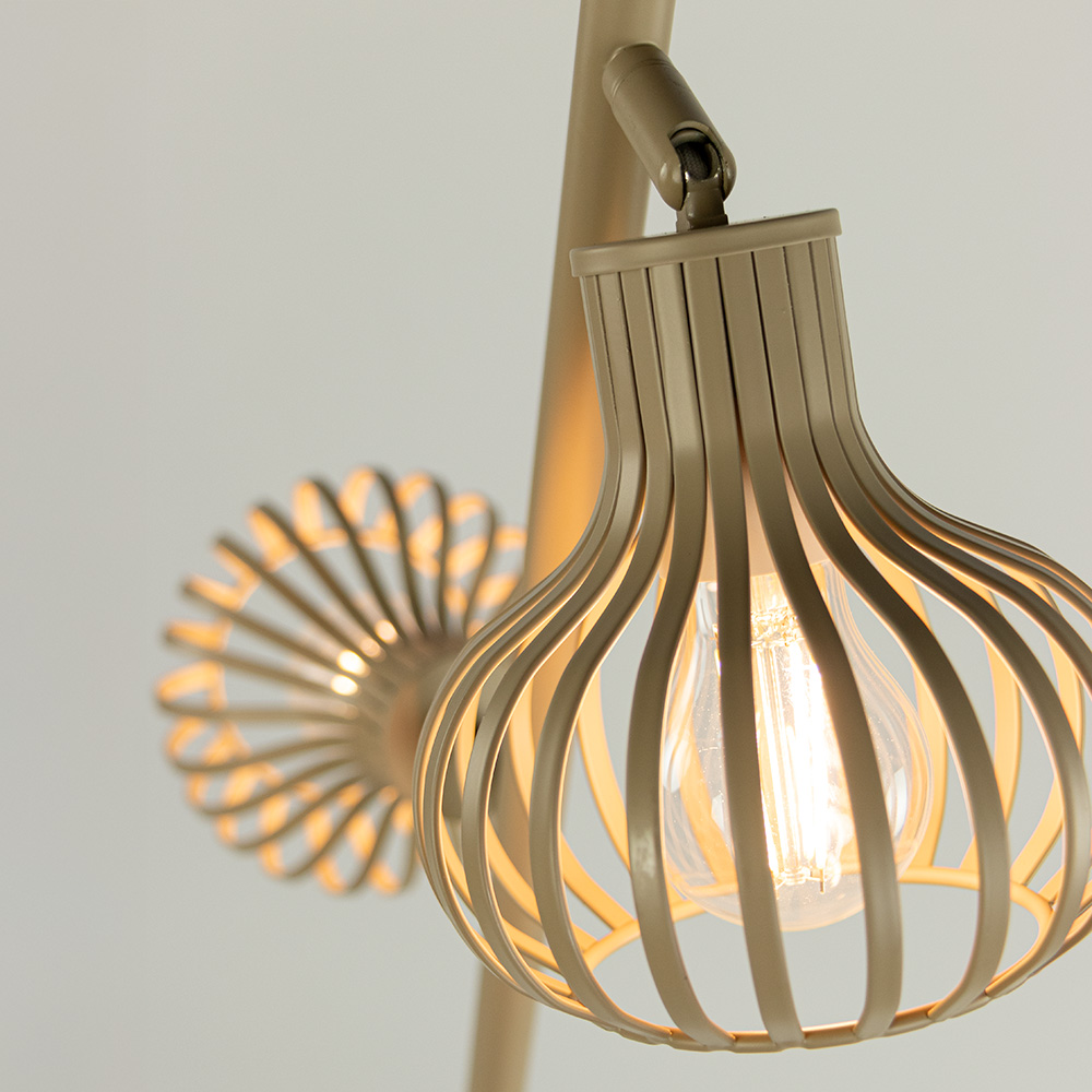 Specificaties: • Afmetingen: 38 x 25 x 160 cm (lxbxh) • Voet: Ø25 x 3 cm • Kap: Ø15 x 15 cm • Materiaal: Metaal • Kleur: Beige • Gewicht: 5,2 kg • Snoerlengte: 220 cm • Schakelaar: Op 75 cm afstand van de voet • Fittingen: 2x E27 (lichtbronnen niet inbegrepen) • Draaibaar en kantelbaar: Ja