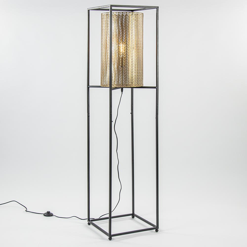 Strak en sfeervol in één. De vierkante vloerlamp is volledig van metaal en bestaat uit een zwart frame die een gouden cilinder-vormige kap ondersteund. Het mat zwarte frame heeft een dikte van 1,5 cm en is voorzien van ronde pootjes. De gouden kap heeft een dessin waar het licht mooi doorheen kan schijnen, maar zorgt ook dat er niet direct in de lichtbron kan worden gekeken. Aan de onderzijde van de gouden kap begint het snoer met een lengte van 290 cm, welke is voorzien van een voetschakelaar. Deze sfeervolle vloerlamp is gemakkelijk toe te passen in diverse woonstijlen als landelijk, romantisch of Oosters. De rechthoekige vloerlamp frame wordt geleverd zonder lichtbron (E27).