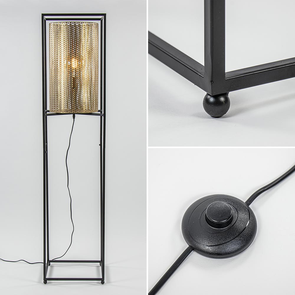 Strak en sfeervol in één. De vierkante vloerlamp is volledig van metaal en bestaat uit een zwart frame die een gouden cilinder-vormige kap ondersteund. Het mat zwarte frame heeft een dikte van 1,5 cm en is voorzien van ronde pootjes. De gouden kap heeft een dessin waar het licht mooi doorheen kan schijnen, maar zorgt ook dat er niet direct in de lichtbron kan worden gekeken. Aan de onderzijde van de gouden kap begint het snoer met een lengte van 290 cm, welke is voorzien van een voetschakelaar. Deze sfeervolle vloerlamp is gemakkelijk toe te passen in diverse woonstijlen als landelijk, romantisch of Oosters. De rechthoekige vloerlamp frame wordt geleverd zonder lichtbron (E27).