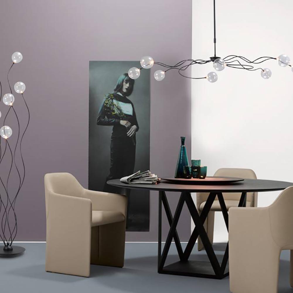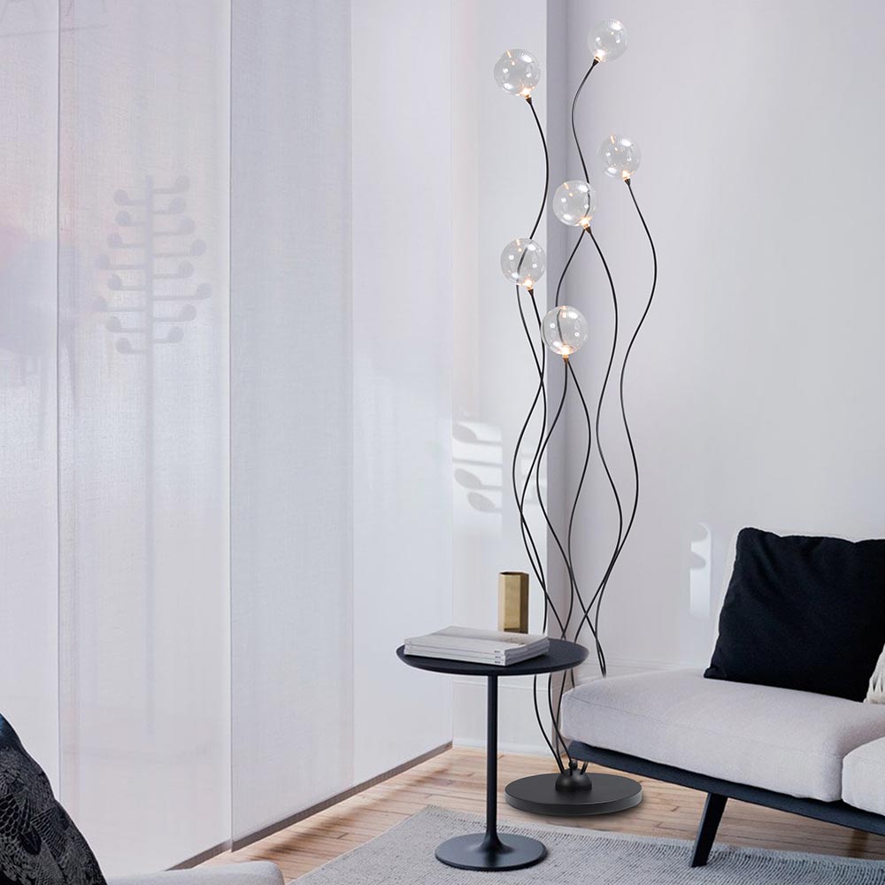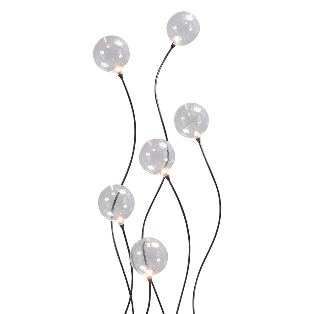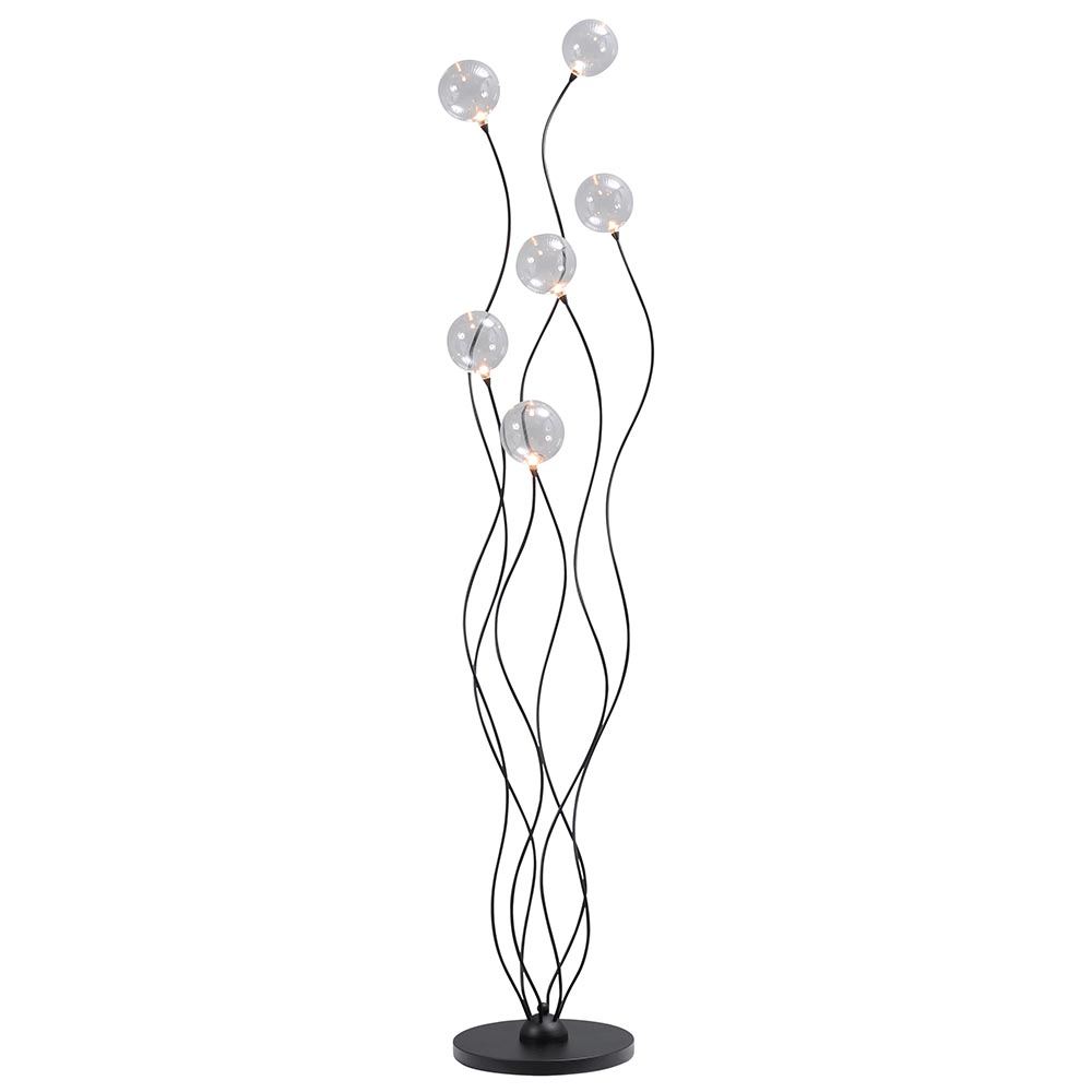 Sierlijk en functioneel. Deze LED vloerlamp is een mooie toevoeging aan het interieur. De vloerlamp is gemaakt van metaal en voorzien van een zwarte finish. Dit geeft de staande lamp een moderne – strak klassieke look. Het armatuur heeft sierlijke armen die aan de uiteinden zijn voorzien van een LED unit en een helder glazen bol. Het LED is dimbaar middels de dimmer in het zwarte snoer. Door erop te drukken gaat de lamp aan of uit en, zodra u links of rechts langer ingedrukt houdt dimt u de lamp naar wens. De helder glazen bollen zijn mooi verdeeld in hoogte waardoor er een leuk speels effect ontstaat. De sierlijke LED vloerlamp geeft met 2200-2700 Kelvin sfeervol warm wit licht.
