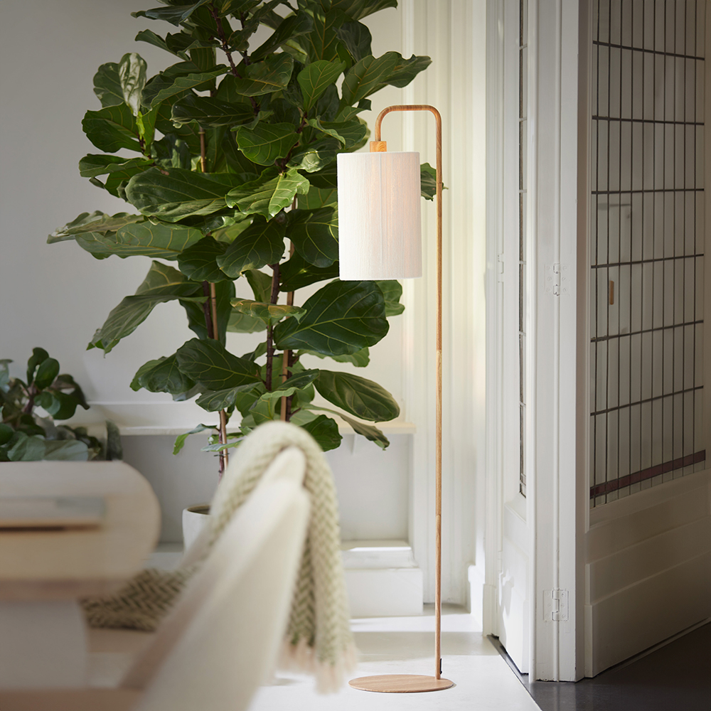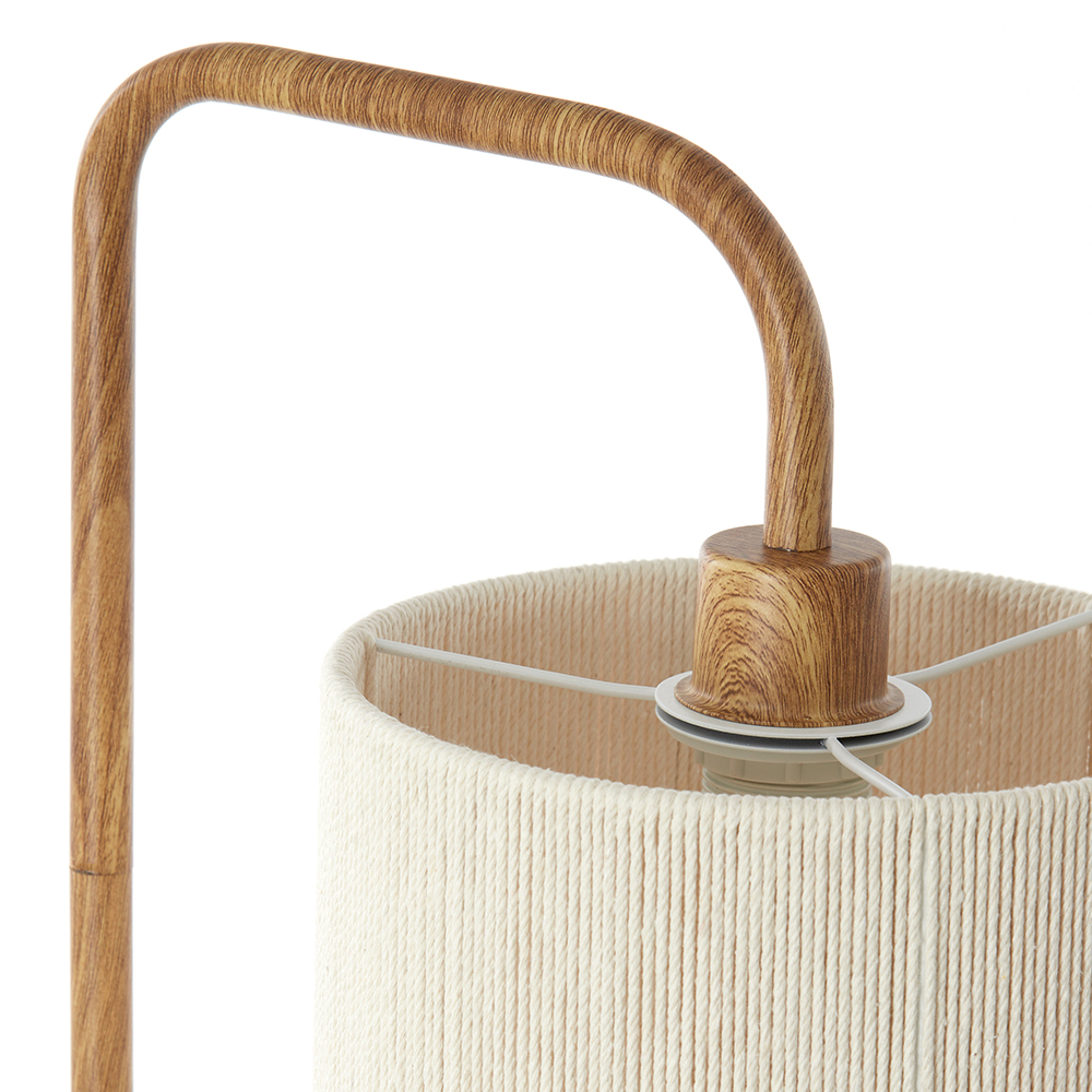 Deze leuke vloerlamp is voorzien van een met wit touw omwonden lampenkap die mooi is gecombineerd met de metalen armatuur, voorzien van een houtlook. De 155 cm hoge lamp is voorzien van een wit snoer met een lengte van 195 cm en een schakelaar op 65 cm. Door het gebruik van de natuurlijke kleuren en materialen die gecombineerd zijn met strakke lijnen past deze mooie vloerlamp onder andere in een botanische-, landelijke- of Scandinavische woonstijl.