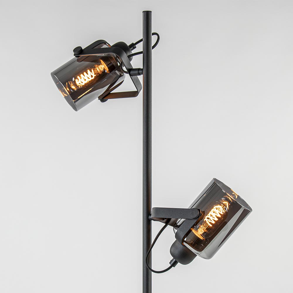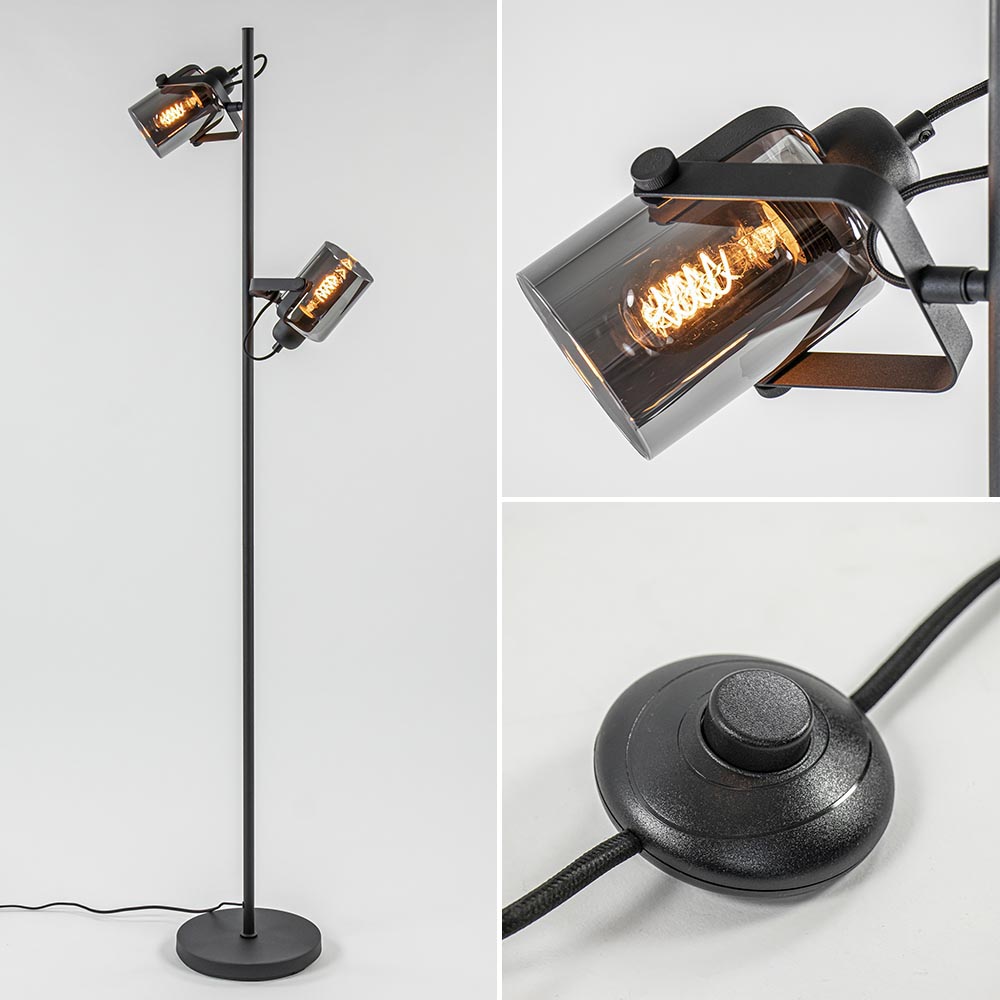 Deze 2-lichts vloerlamp is prima geschikt voor diverse woonstijlen. De staande lamp heeft een metalen armatuur dat is afgewerkt met een mat zwarte finish. Dit geeft de vloerlamp een stoere look die mooi past bij de titanium/smoke glazen kappen. De kappen zijn naar wens te verstellen door deze te draaien en/of te kantelen. Het titanium glas heeft een spiegelende werking die donker transparant, oftwel smoke, kleurt zodra de lamp inschakelt. Dit geeft de lamp een luxe chique uitstraling. De 2-lichts vloerlamp heeft een zwart snoer van 200 cm, met een voetschakelaar op 50 cm. De lichtbron is exclusief (2x E27).
