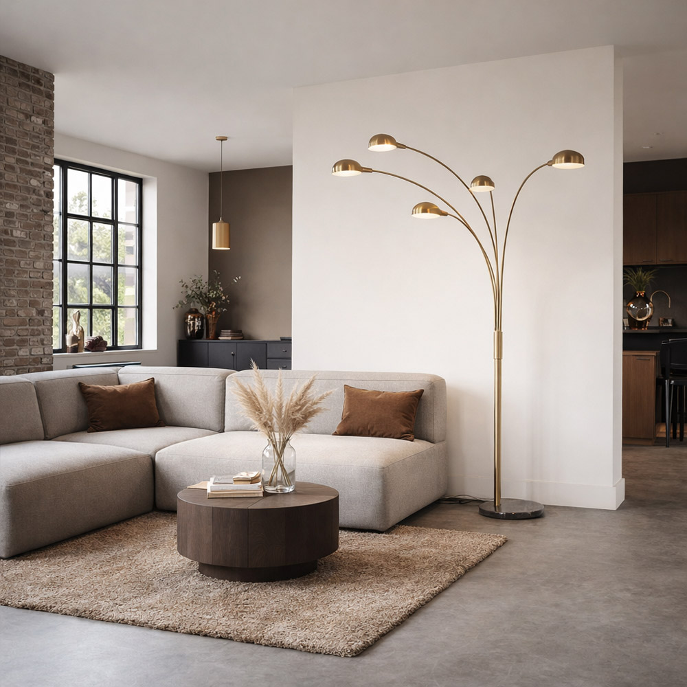 Een echte eyecatcher voor de woonkamer. Deze stijlvolle vloerlamp met vijf gebogen armen combineert speels design met functionele verlichting. Vanuit de centrale staander waaieren de armen elegant uit, waardoor de lamp een luchtige en dynamische uitstraling krijgt. Perfect naast een ruime bank of in een leeshoek waar zowel sfeer als licht gewenst is.