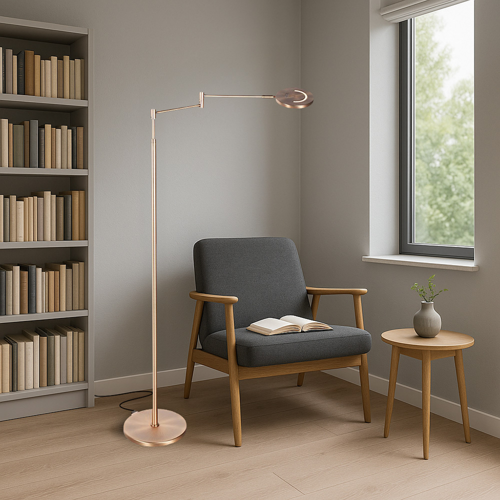 Deze stijlvolle vloerlamp in geborsteld brons is een verfijnde toevoeging aan ieder interieur. Dankzij de verstelbare arm en draaibare kop richt je het licht precies waar je het nodig hebt – ideaal voor lezen, werken of ontspannen. De geïntegreerde LED-verlichting zorgt voor warm wit licht dat energiezuinig én prettig voor de ogen is. Het slanke ontwerp en de warme bronskleur geven de lamp een moderne, maar tijdloze uitstraling. Perfect te plaatsen naast een fauteuil of bank.