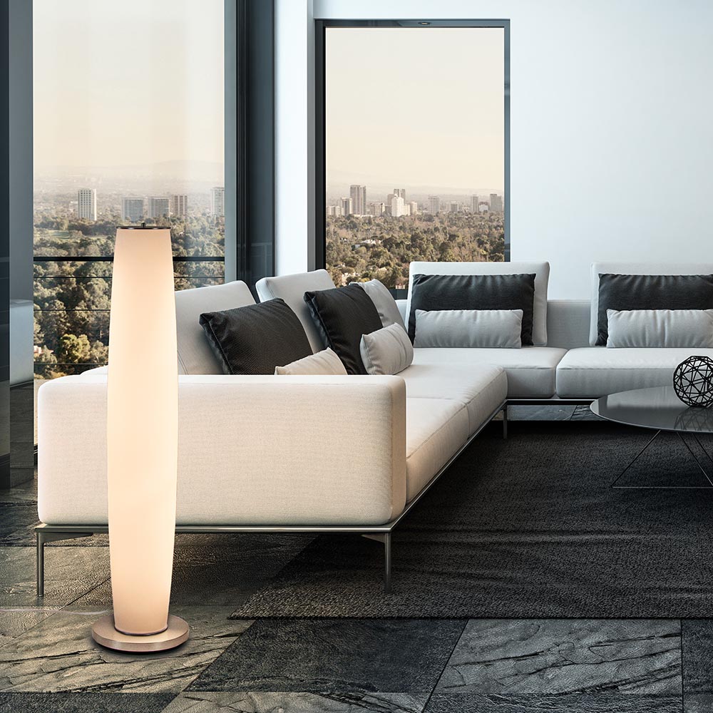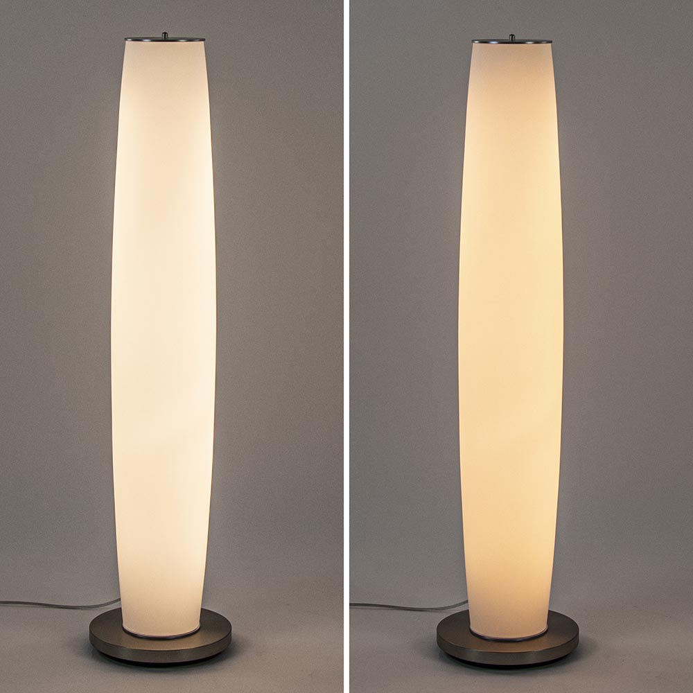 Een kleine vloerlamp met een groots effect. Deze design vloerlamp heeft een strakke vormgeving en bestaat uit een opaal glazen kap die wordt ondersteund door een nikkel armatuur. De moderne vloerlamp is voorzien van LED met een dim to warm functie. Dit houdt in dat u de lamp kunt dimmen in kleurtemperatuur tussen de 2200 en 2700 Kelvin. Creëer dus gemakkelijk en snel de juiste sfeer door de dimmer op het armatuur ingedrukt te houden. Houdt u de dimmer langer ingedrukt, dan dimt de lamp ook in intensiteit. De design lamp past door z’n grootte op vele plekken in huis en zorgt waar hij ook staat voor een fijne sfeer.