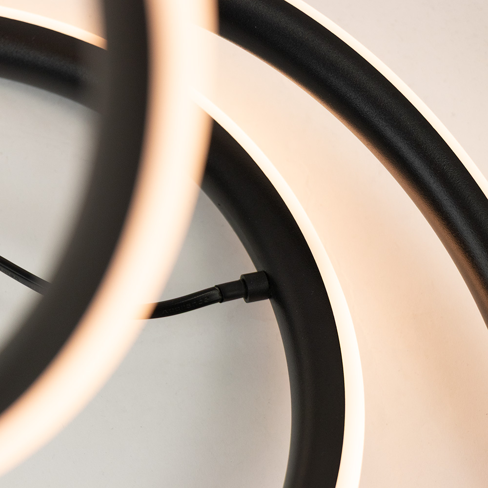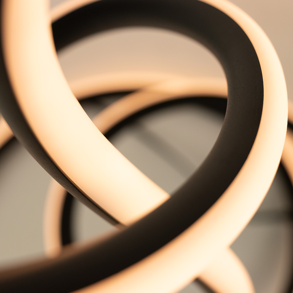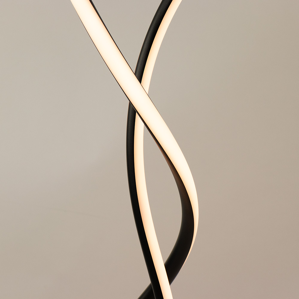 Breng kunst en verlichting samen met deze moderne LED vloerlamp. Het sculpturale ontwerp, bestaande uit een sierlijk in elkaar draaiende lichtlijnen, die een opvallende en elegante uitstraling creëert in elke ruimte. De zwarte afwerking geeft de lamp een strak en tijdloos karakter, terwijl de geïntegreerde LED’s een warm wit licht verspreiden voor een sfeervol geheel. Met zijn hoogte en vloeiende vormen komt deze vloerlamp prachtig tot zijn recht in een woonkamer, leeshoek of modern kantoor.