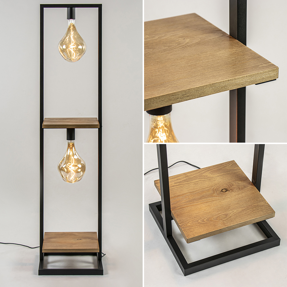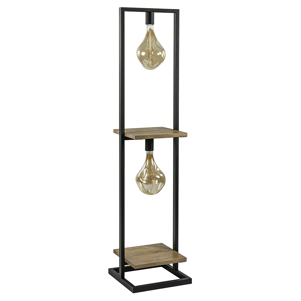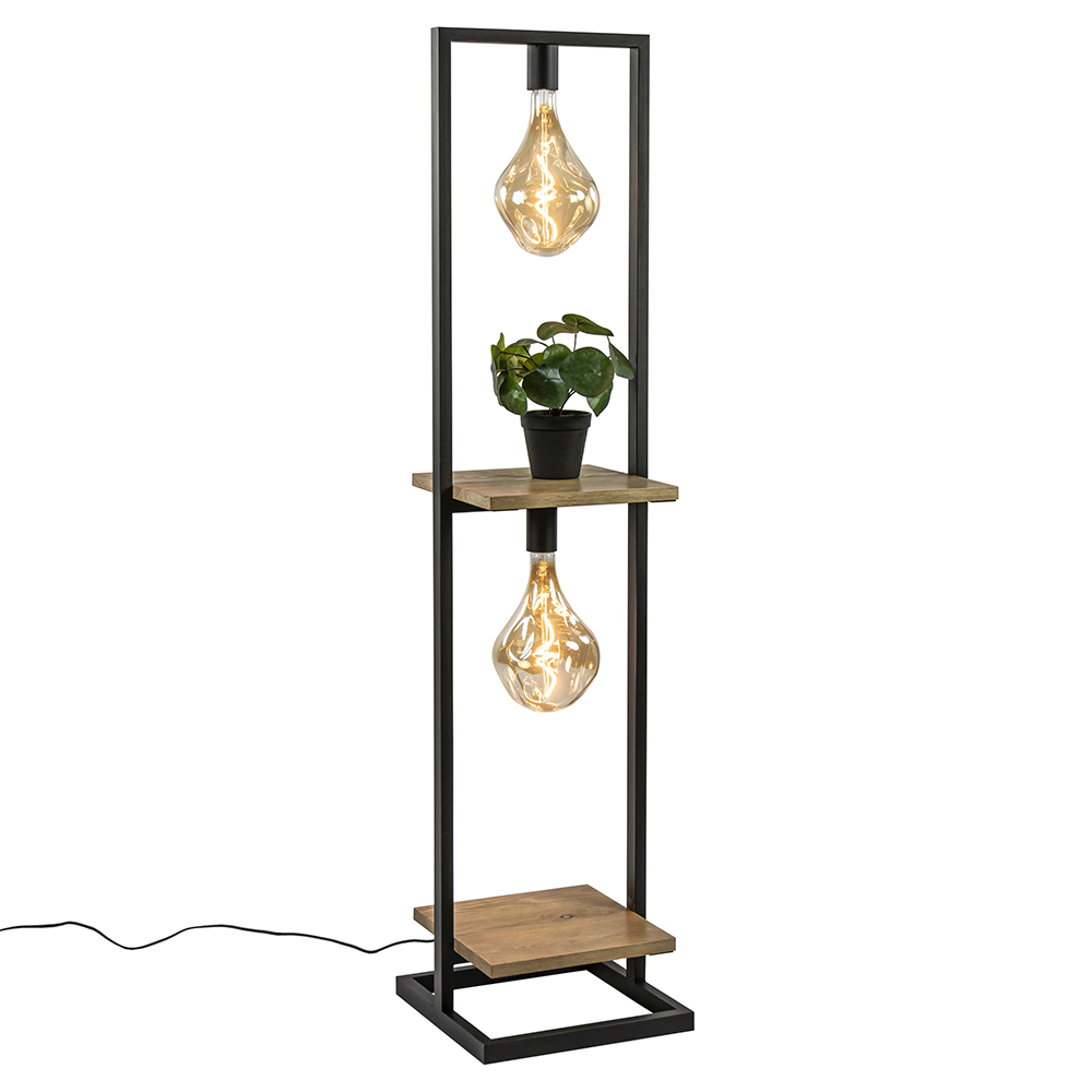 Leuke trendy 2-lichts vloerlamp. Deze staande lamp is uitgevoerd in zwart staal. Daarnaast is hij voorzien van twee plankjes, hierdoor kun je hem naast verlichting ook gebruiken om decoratie op te zetten. Je kunt denken aan een fotollijstje, plantje of andere accessoires. Door de E27 fitting kun je diverse lichtbronnen gebruiken waardoor je zelf de sfeer bepaald.