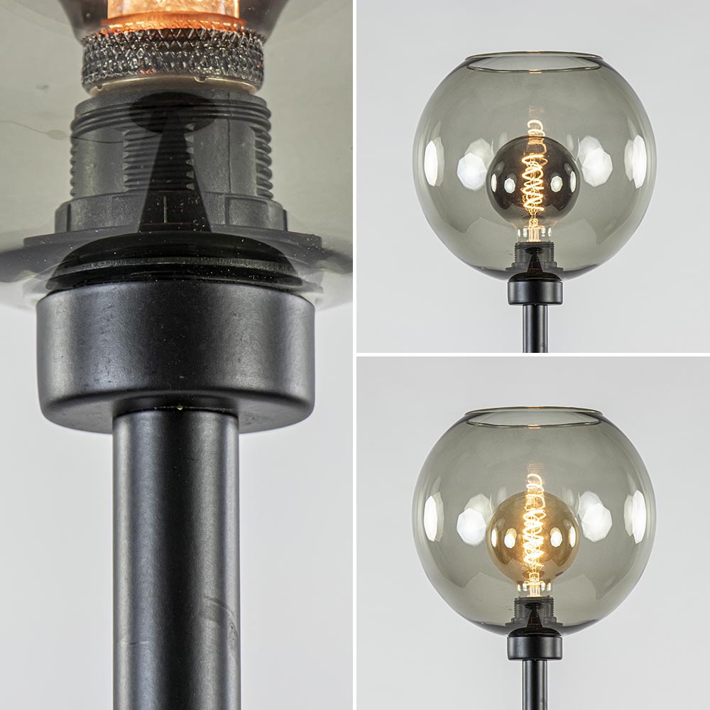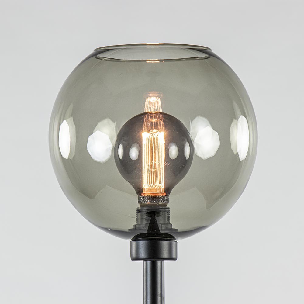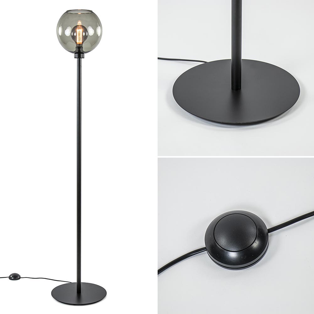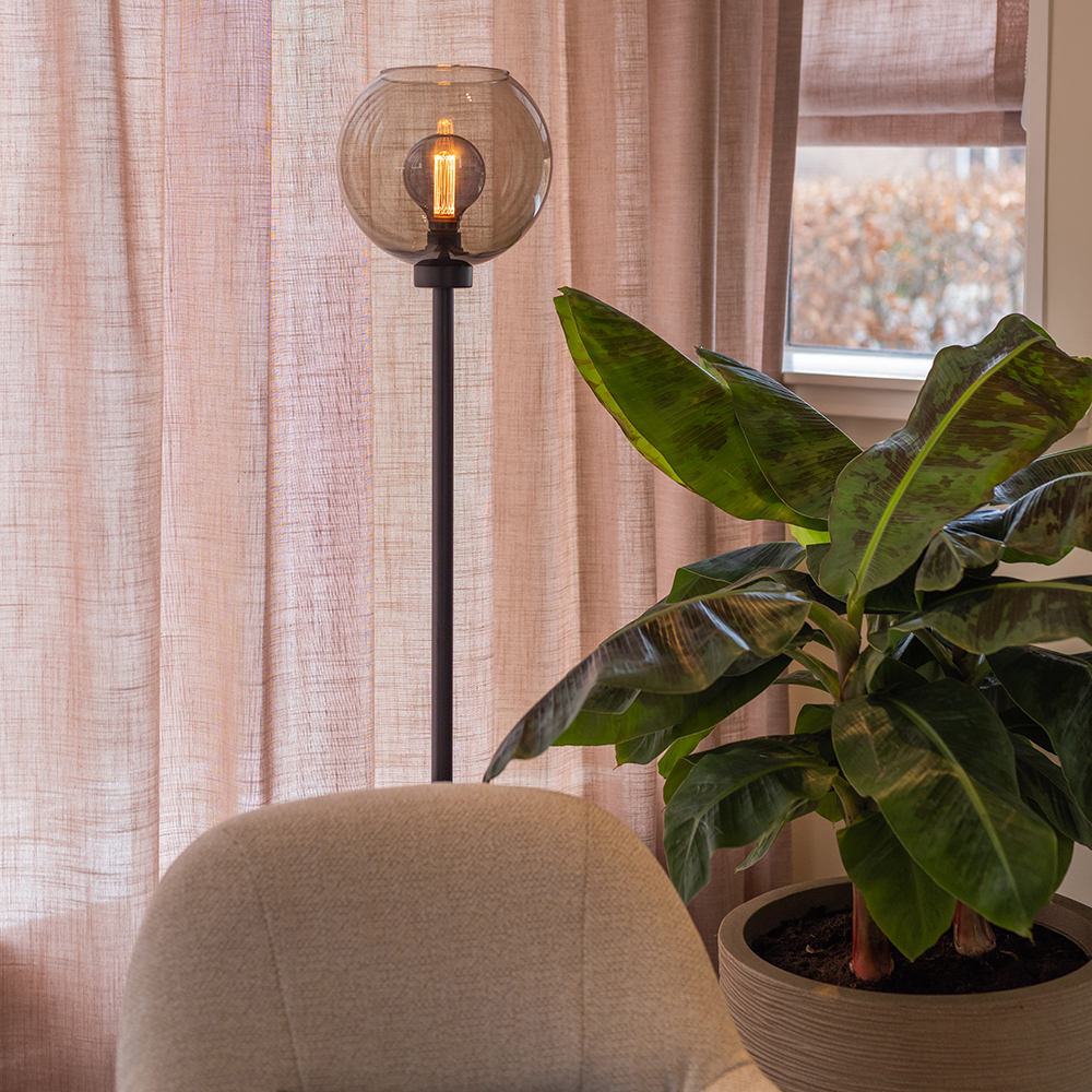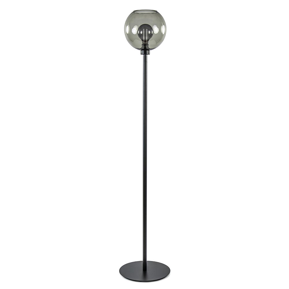 Deze moderne vloerlamp is gecombineerd met een smoke glazen kap die helemaal past binnen de huidige trends. Het glas geeft een stoere en luxe uitstraling die zorgt dat de lamp is diverse woonstijlen kan worden gecombineerd. De smoke glazen bol wordt ondersteund door een mat zwart armatuur dat is voorzien van een zwart snoer van 185 cm, met een voetschakelaar op 45 cm van de voet. De moderne vloerlamp wordt geleverd zonder lichtbron (E27).
