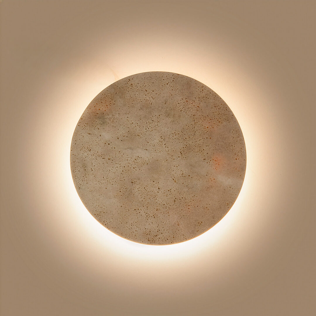Dankzij de geïntegreerde LED-verlichting (2700K, 9W) straalt de Alysia een warme, subtiele lichtcirkel uit achter de stenen schijf. Via je normale wandschakelaar schakel je eenvoudig tussen drie lichtsterktes, ideaal voor zowel sfeer als functioneel licht. Perfect in de hal, woonkamer of als duo boven een dressoir voor een stijlvolle, warme uitstraling.