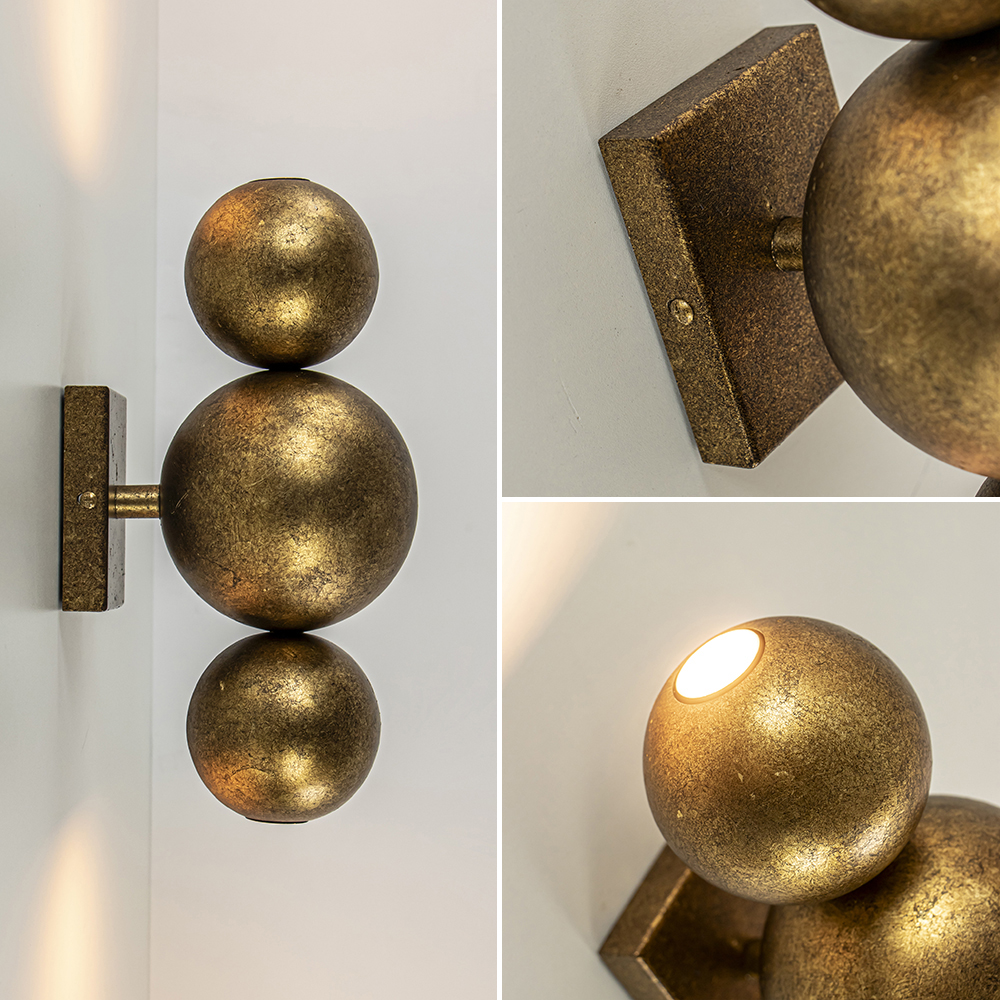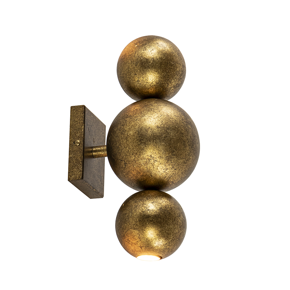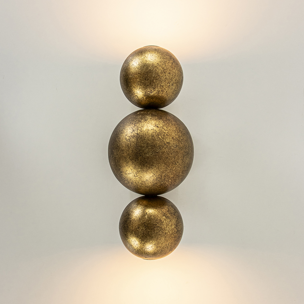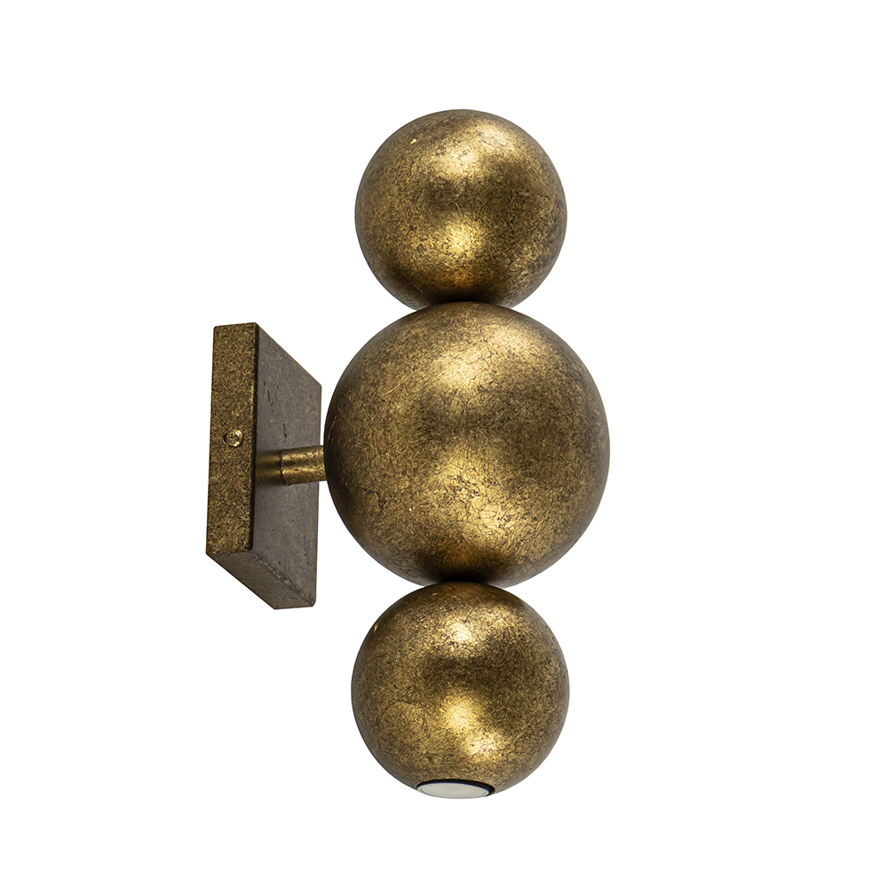 Klein van stuk maar groots in effect. Deze design wandlamp zorgt voor een sfeervol effect in de ruimte. De wandlamp bestaat uit 3 metalen bollen die zijn bevestigd op een wandplaat. De bovenste en onderste bol zijn voorzien van een E14 lichtpunt inclusief LED lichtbron. De wandlamp functioneert dan ook als een up en downlighter. Ideaal voor in een hal, woonkamer of slaapkamer. De wandlamp is volledig gemaakt van metaal en uitgevoerd in het ambachtelijk brons wat een chique en robuuste uitstraling geeft. De wandlamp is niet voorzien van een snoer.