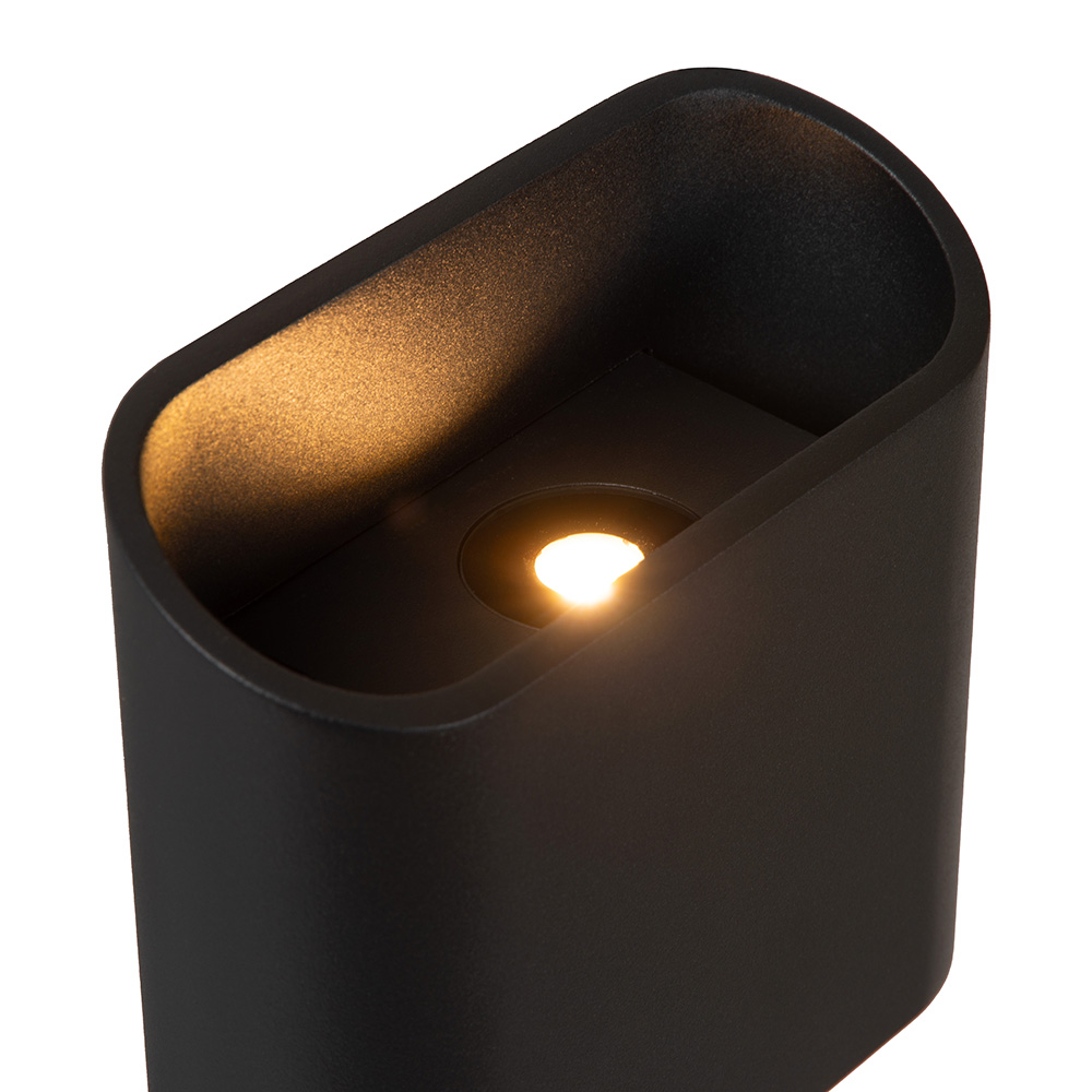 Deze moderne up & down wandlamp is een echte blikvanger voor aan de buitenmuur. Het strakke, afgeronde ontwerp in matzwart zorgt voor een eigentijdse uitstraling. De lamp schijnt zowel naar boven als naar beneden en creëert zo een sfeervol lichteffect op de muur. Gemaakt van hoogwaardig aluminium en geschikt voor buitengebruik dankzij de spatwaterdichte afwerking (IP54). Perfect voor het verlichten van je gevel, tuinpad, terras of entree.
