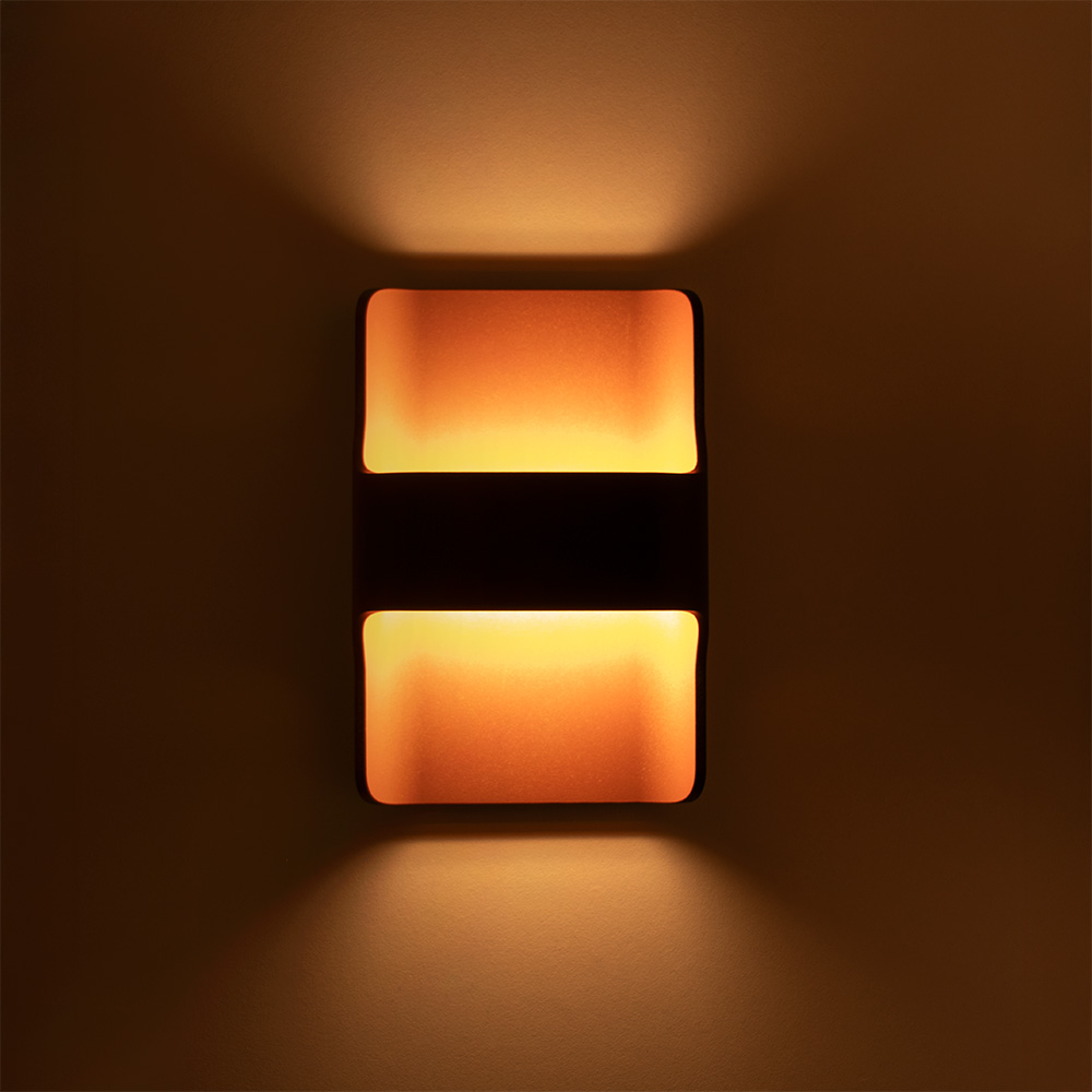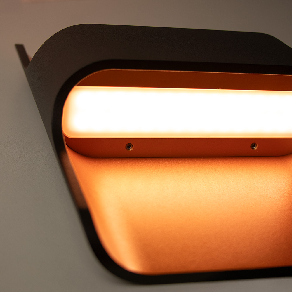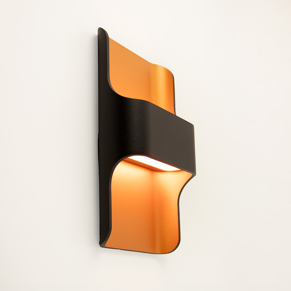 Mooie strakke wandlamp uitgevoerd in metaal en gespoten in zwart en goud. De gouden binnenkant zorgt voor een mooie warme uitstraling zowel uit als aan. Deze trendy zwarte wandlamp is voorzien van twee lichtbronnen, beide geïntegreerd LED met een lichtopbrengst van 720 lumen per stuk. Kortom goed licht zowel naar boven als naar beneden. Wanneer u wilt, kunt u deze wandlamp dimmen met een externe dimmer aan de wand (deze wordt niet meegeleverd).
