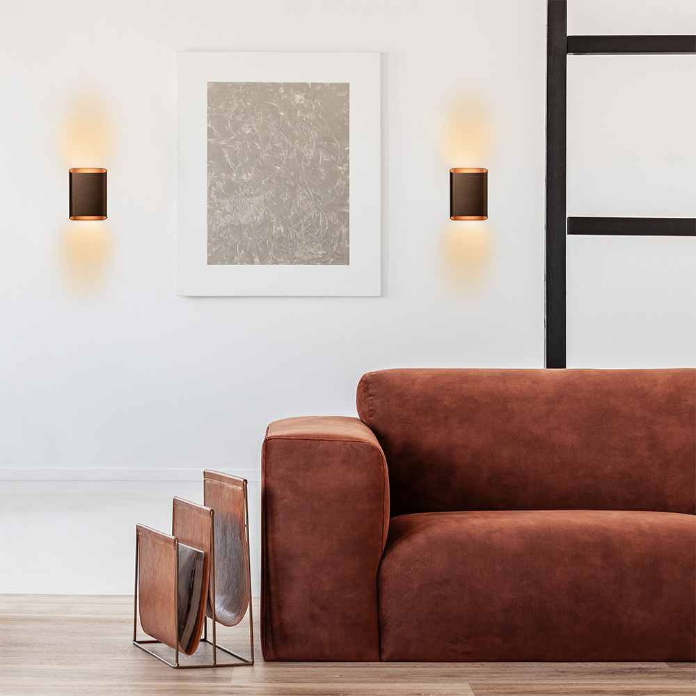 Mooi strak design wandlamp uitgevoerd in de kleur brons. Een mooie sfeermaker voor in de hal, woonkamer of slaapkamer. De wandlamp is klein van stuk maar zorgt voor een groot effect in de ruimte. Deze bronze wandlamp werkt als een up- & downlighter, hij geeft zowel licht naar boven als naar beneden langs de muur doormiddel van geïntergreerd LED. De wandlamp is dimbaar middels een externe dimmer.