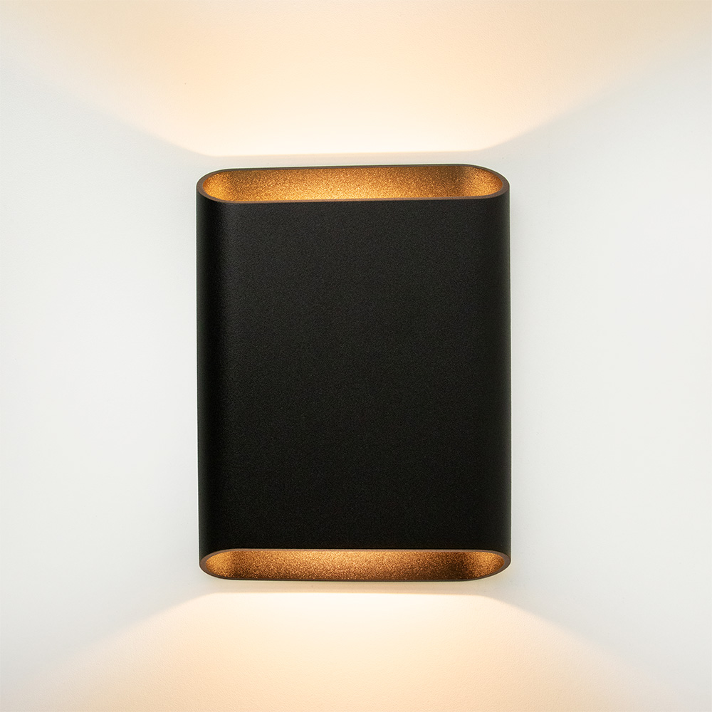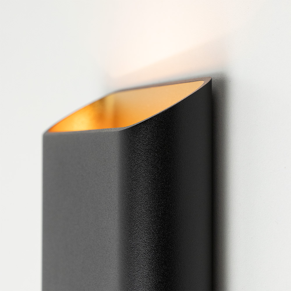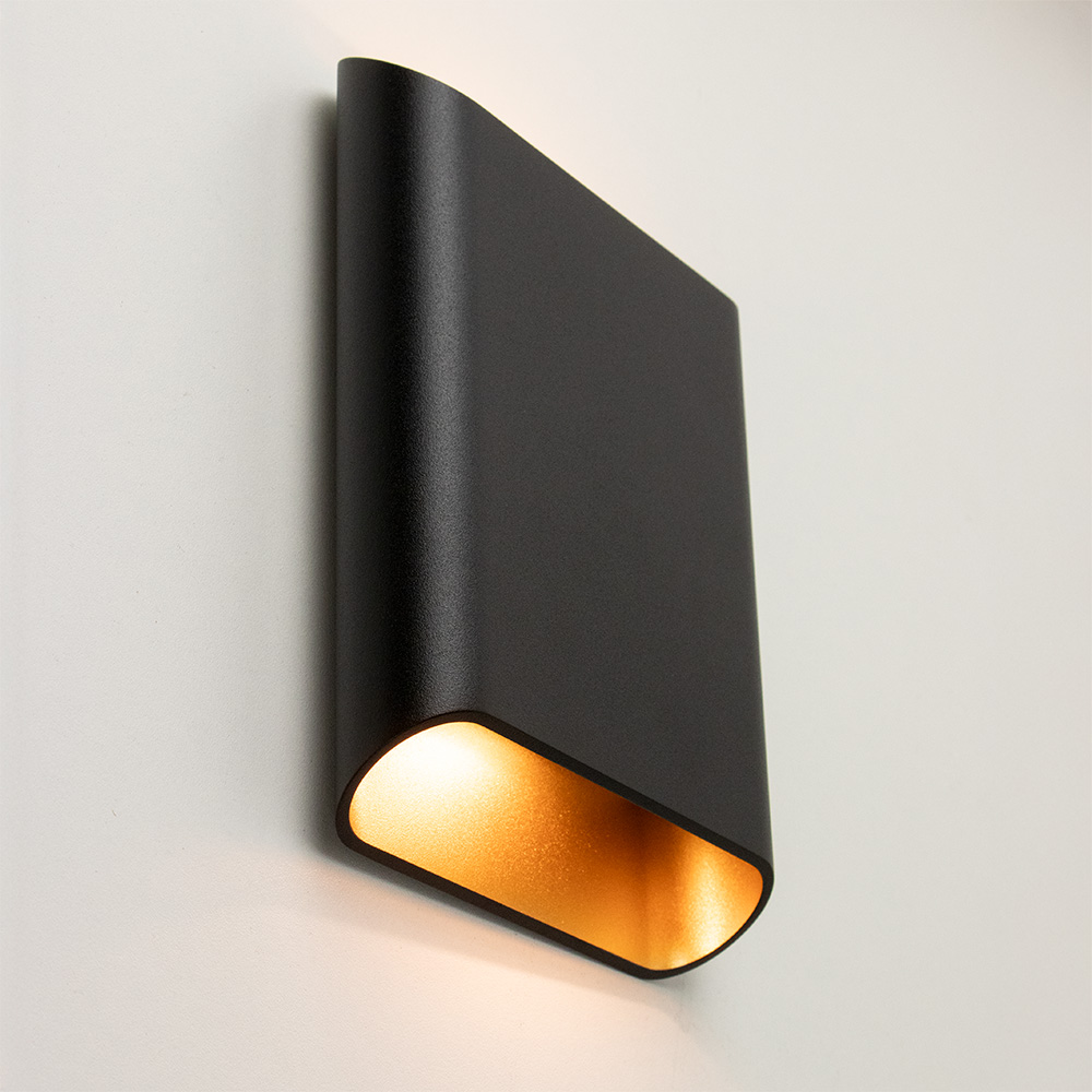 Mooi strak design wandlamp uitgevoerd in de kleur zwart & matgoud. Een mooie sfeermaker voor in de hal, woonkamer of slaapkamer. De wandlamp is klein van stuk maar zorgt voor een groot effect in de ruimte. Deze bronze wandlamp werkt als een up- & downlighter, hij geeft zowel licht naar boven als naar beneden langs de muur doormiddel van geïntergreerd LED. De wandlamp is dimbaar middels een externe dimmer.