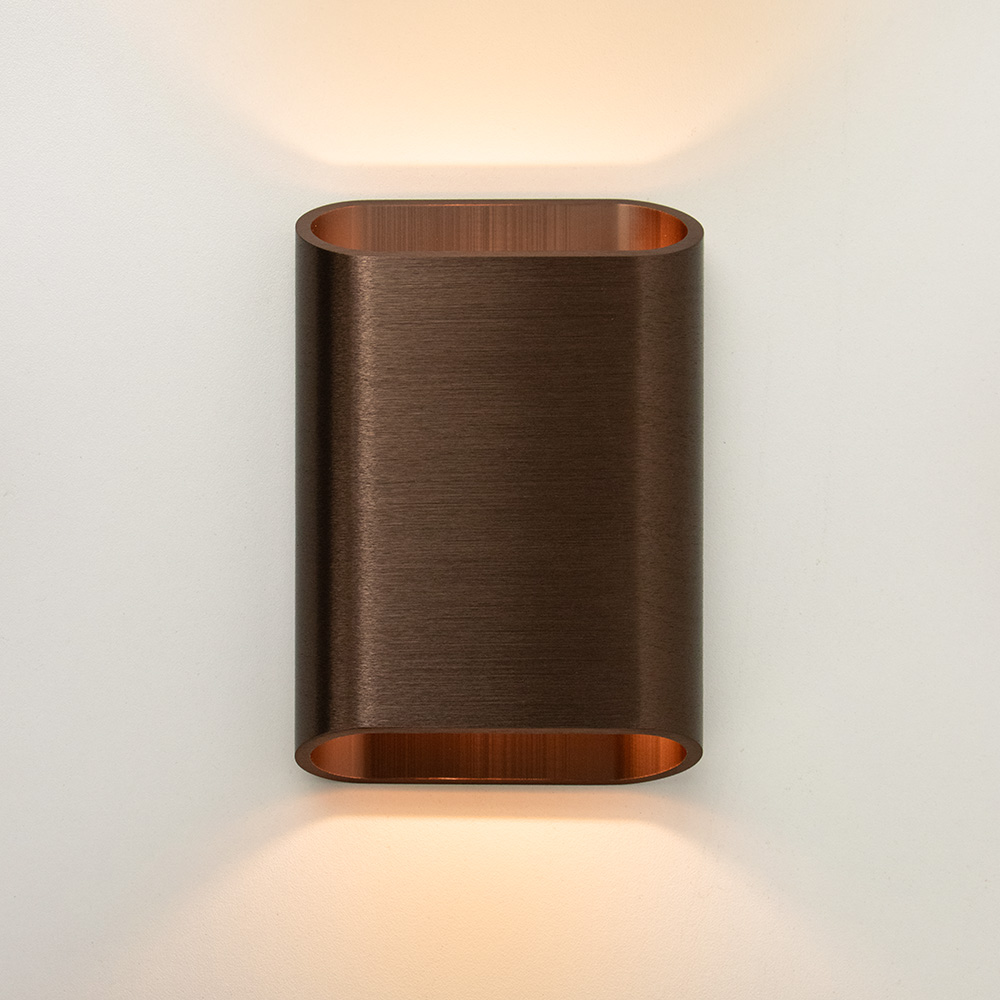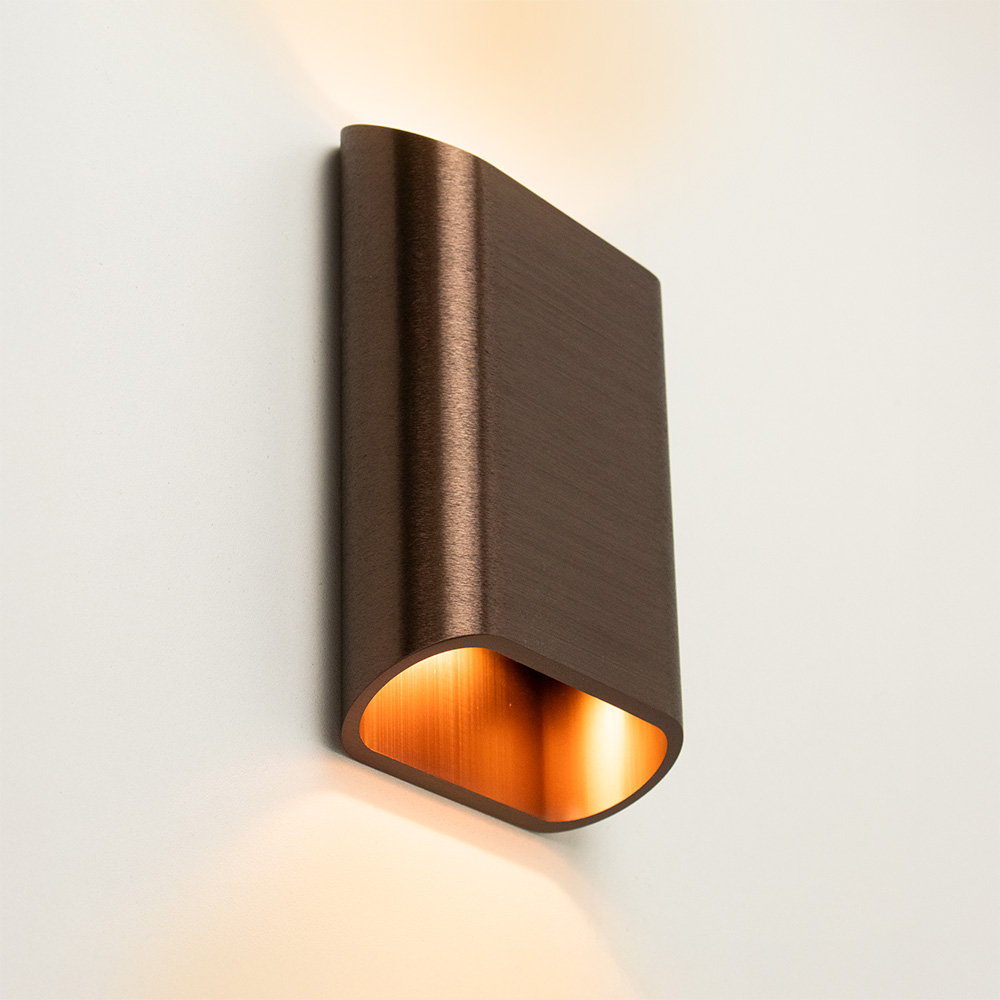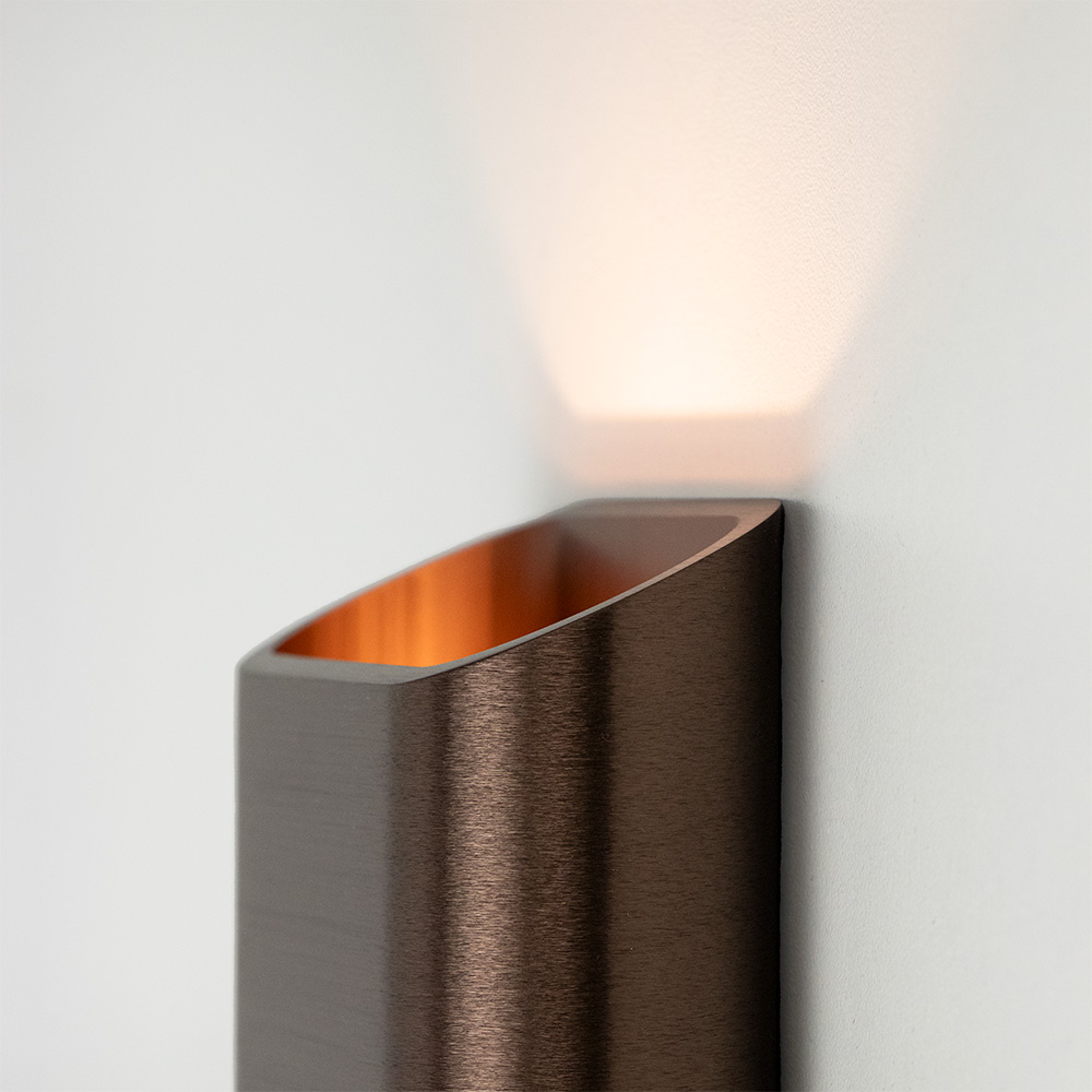 Mooi strak design wandlamp uitgevoerd in de kleur brons. Een mooie sfeermaker voor in de hal, woonkamer of slaapkamer. De wandlamp is klein van stuk maar zorgt voor een groot effect in de ruimte. Deze bronze wandlamp werkt als een up- & downlighter, hij geeft zowel licht naar boven als naar beneden langs de muur doormiddel van geïntergreerd LED. De wandlamp is dimbaar middels een externe dimmer.