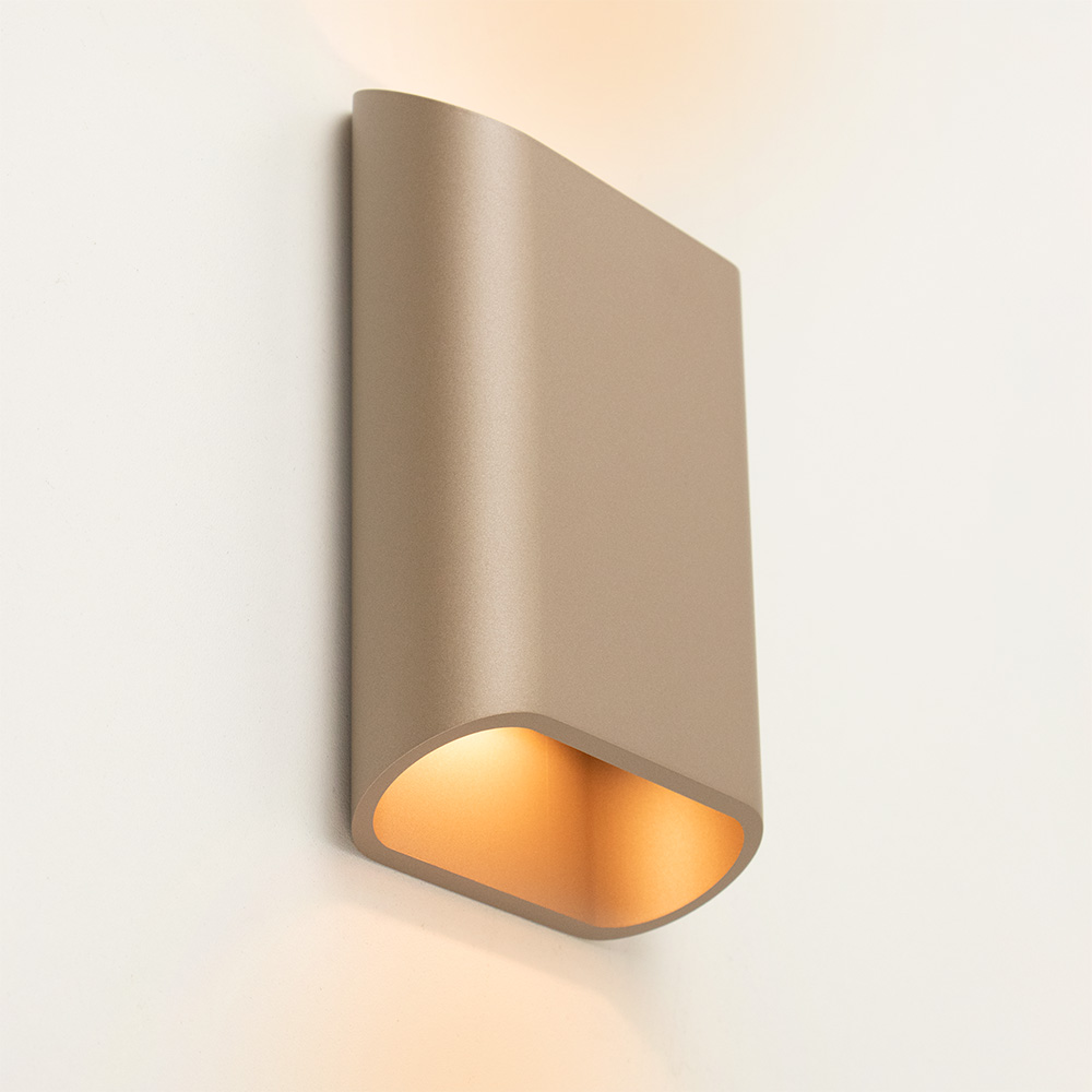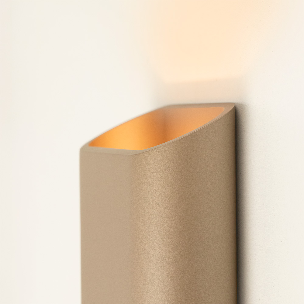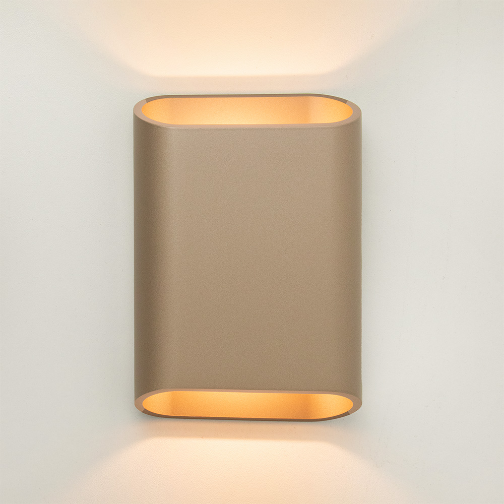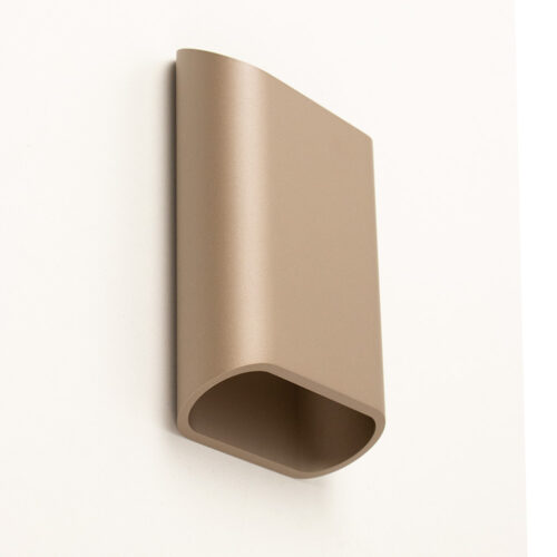 Mooi strak design wandlamp uitgevoerd in de kleur champagne. Een mooie sfeermaker voor in de hal, woonkamer of slaapkamer. De wandlamp is klein van stuk maar zorgt voor een groot effect in de ruimte. Deze bronze wandlamp werkt als een up- & downlighter, hij geeft zowel licht naar boven als naar beneden langs de muur doormiddel van geïntergreerd LED. De wandlamp is dimbaar middels een externe dimmer.