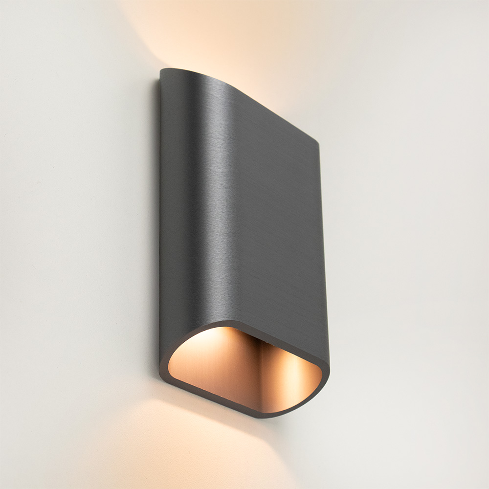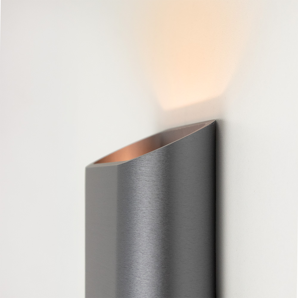 Mooi strak design wandlamp uitgevoerd in de kleur gunmetal. Een mooie sfeermaker voor in de hal, woonkamer of slaapkamer. De wandlamp is klein van stuk maar zorgt voor een groot effect in de ruimte. Deze bronze wandlamp werkt als een up- & downlighter, hij geeft zowel licht naar boven als naar beneden langs de muur doormiddel van geïntergreerd LED. De wandlamp is dimbaar middels een externe dimmer.