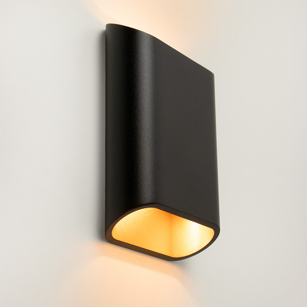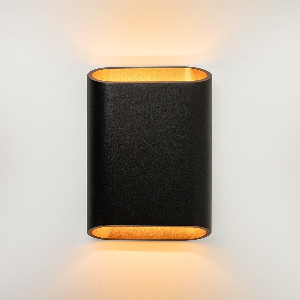 Mooi strak design wandlamp uitgevoerd in de kleur zwart & mat goud. Een mooie sfeermaker voor in de hal, woonkamer of slaapkamer. De wandlamp is klein van stuk maar zorgt voor een groot effect in de ruimte. Deze bronze wandlamp werkt als een up- & downlighter, hij geeft zowel licht naar boven als naar beneden langs de muur doormiddel van geïntergreerd LED. De wandlamp is dimbaar middels een externe dimmer.