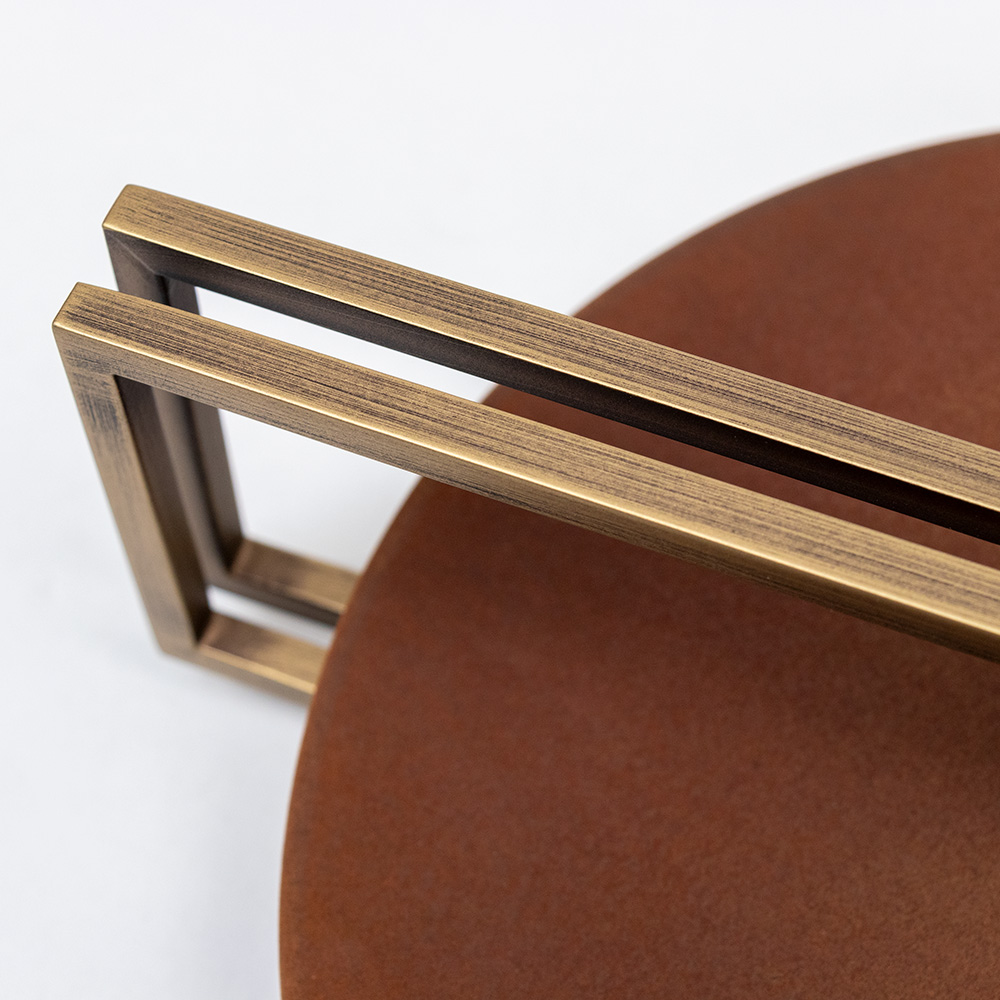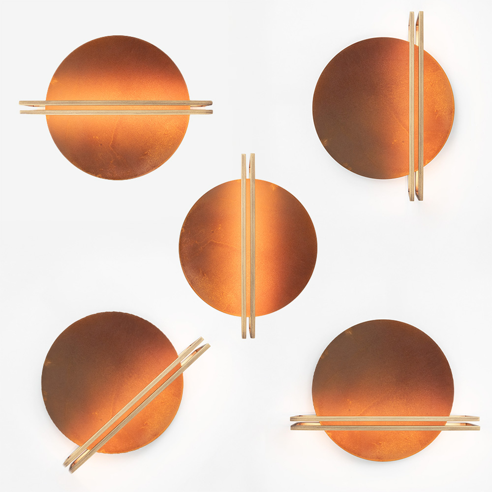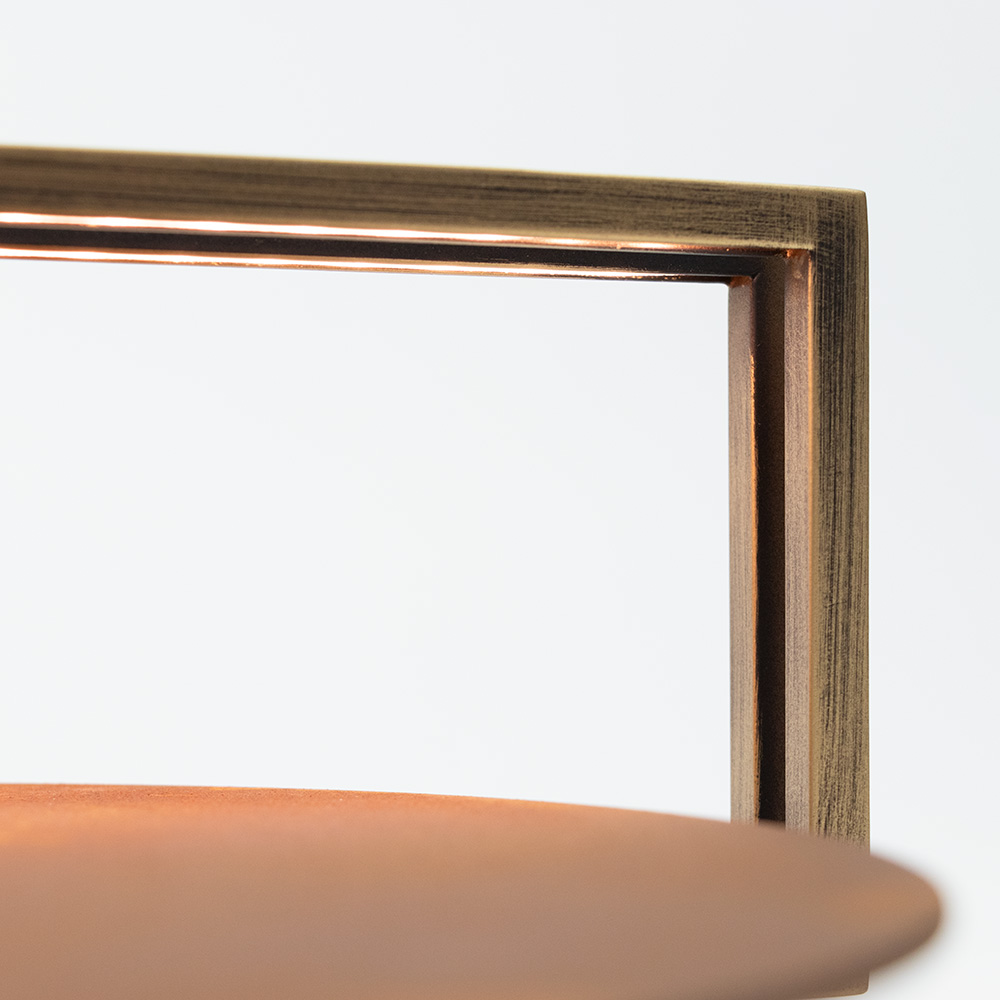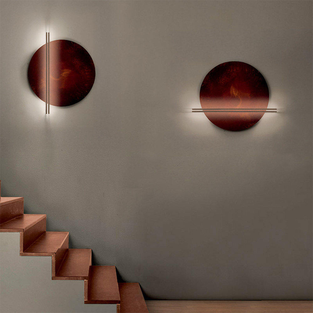 Laat je interieur stralen met deze unieke wand- en plafondlamp, uitgevoerd in een opvallende combinatie van roestkleurig staal en geborstelde messing accenten. Het ontwerp speelt met geometrie en contrast: een ronde, warme roestbruine plaat wordt doorkruist door twee strakke, verticale metalen staven met een vintage messing afwerking. Het resultaat is een kunstzinnige lichtbron die zowel sfeer als stijl toevoegt aan elke ruimte. Deze lamp is veelzijdig in gebruik: hang hem horizontaal of verticaal aan de wand als wandlamp, of monteer hem aan het plafond voor een subtiel grafisch statement. Dankzij het indirecte licht dat langs de achterzijde van de plaat schijnt, ontstaat er een warme, diffuse gloed die perfect is voor sfeerverlichting in woonkamers, hallen of slaapkamers.