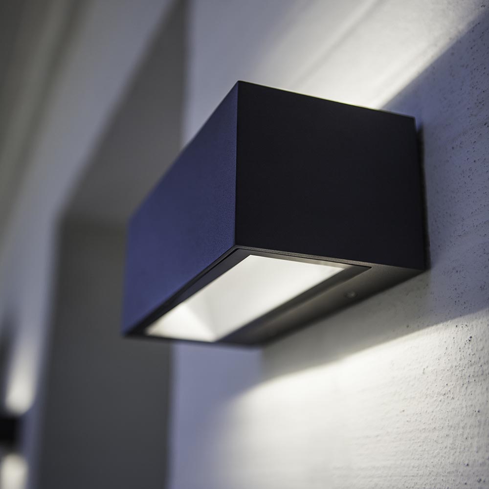 Stoere rechthoekige buitenverlichting met geïntegreerd LED. Deze langwerpige buitenlamp heeft een groot lichtbereik met 1230 Lumen en een lamp aan zowel de boven als de onderkant. De wandlamp werkt dus als een up en downlighter. Deze donker grijze buitenlamp is een echte eye-catcher door zijn moderne uitstraling. Doordat de behuizing helemaal dicht is, is de buitenlamp IP54 goedgekeurd. Ideaal voor op een schuur, schutting of overkapping.