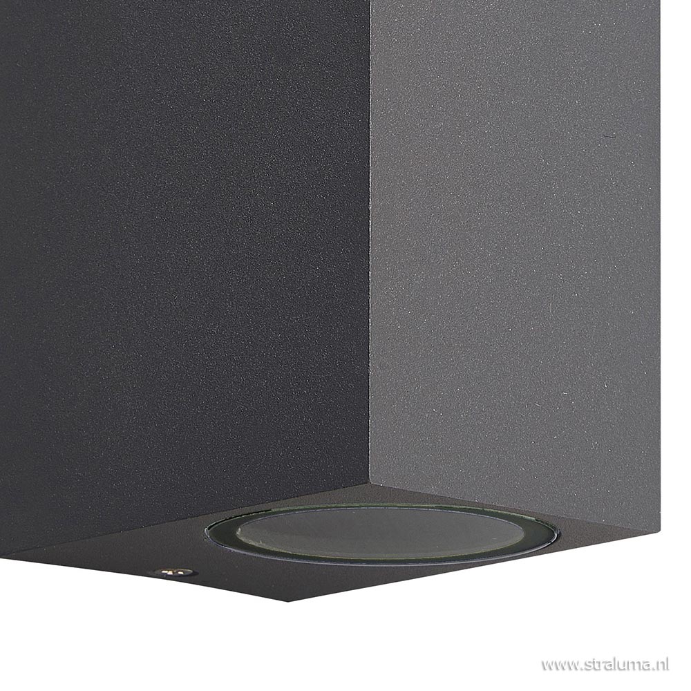 Maak het genieten van uw tuin nu nog fijner met deze sfeervolle wandspot. De antraciete wandlamp is gemaakt van aluminium en heeft een strak en minimalistisch design. Het mooie aan de buiten wandlamp, is dat deze is voorzien van een up- en downlighter wat een sfeervol zandloper effect creëert op de muur of schutting. De lichtbronnen (2x GU10) zijn exclusief zodat u zelf kunt kiezen wat voor warmte en sfeer u wenst in uw tuin. Het antraciete buitenspotje is IP54 goedgekeurd en weerbestendig -10° tot +45°C.