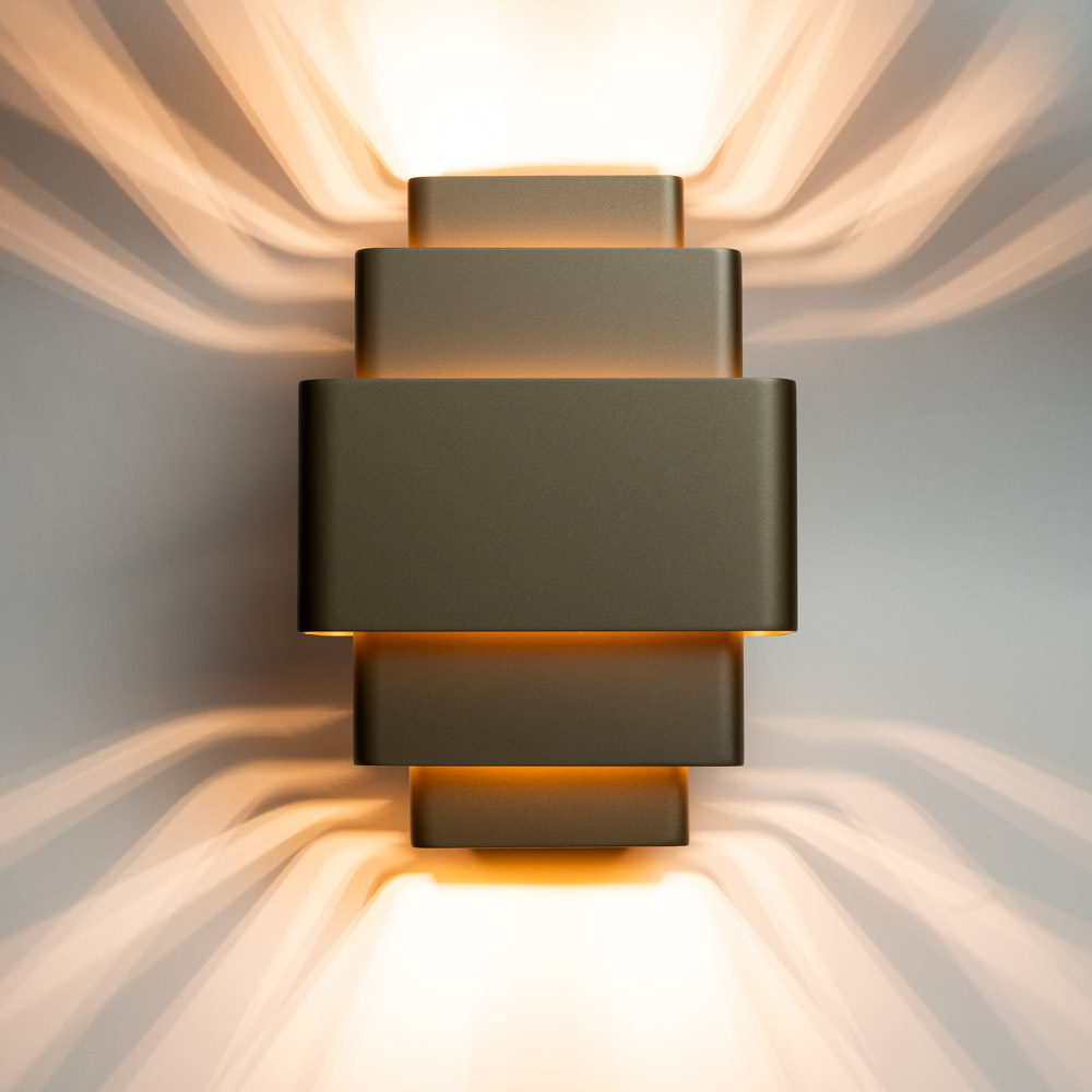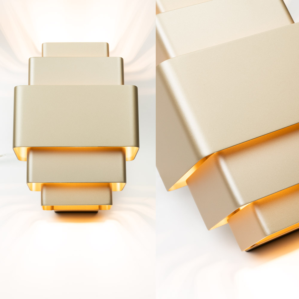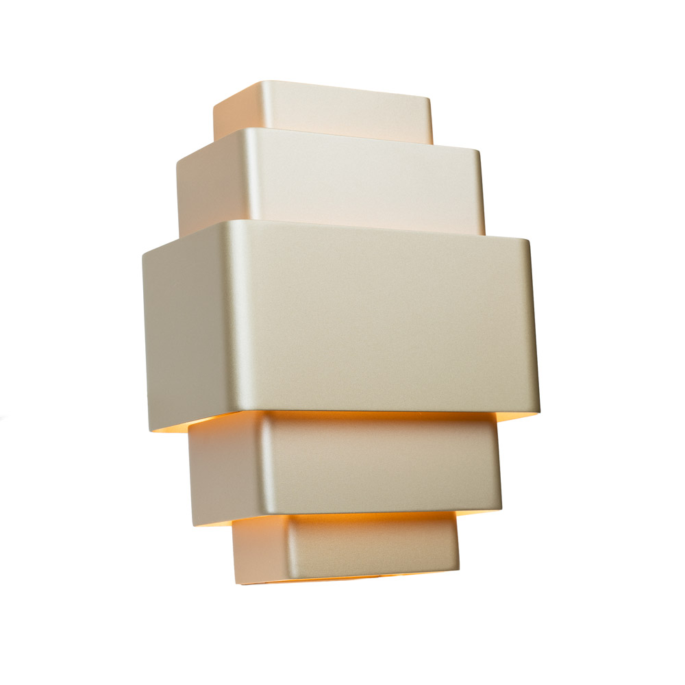De Layes wandlamp in champagnekleur is een echte blikvanger voor wie houdt van modern design met karakter. De gelaagde opbouw van het armatuur zorgt voor een bijzonder lichtspel op de muur, waarbij het licht zowel omhoog als omlaag wordt verspreid. Dit maakt de lamp perfect als sfeerverlichting én als decoratief element.