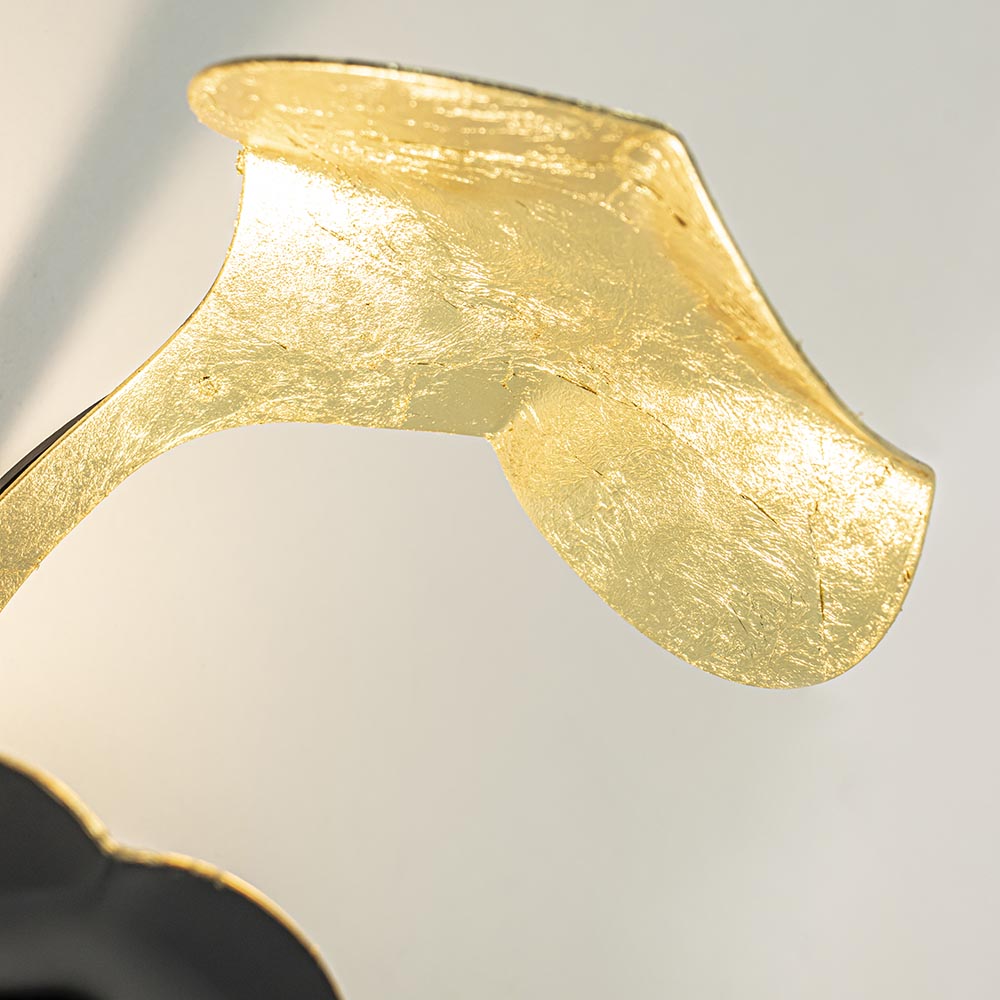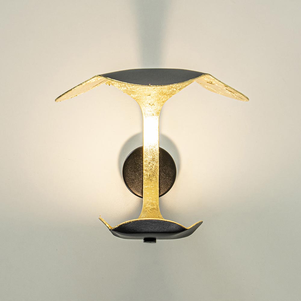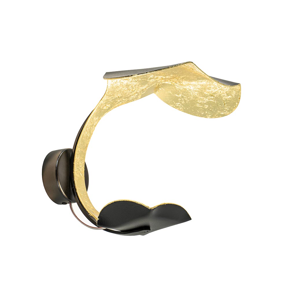 Fijne sfeervlichting voor in een hal, woonkamer of slaapkamer. Deze design wandlamp is een verrijking voor het interieur. De wandlamp is voorzien van LED verlichting en volledig gemaakt van metaal. Dit is afgewerkt met een zwarte en goldleaf finish wat de lamp een chique en luxe uitstraling geeft. De LED wandlamp zorgt voor fijne indirecte verlichting en daardoor voor een speels schouwspel op in de ruimte. De design wandlamp is niet voorzien van een snoer en dient dan ook direct op een stroompunt te worden geplaatst. De goldleaf wandlamp is dimbaar middels een externe dimmer (exclusief).