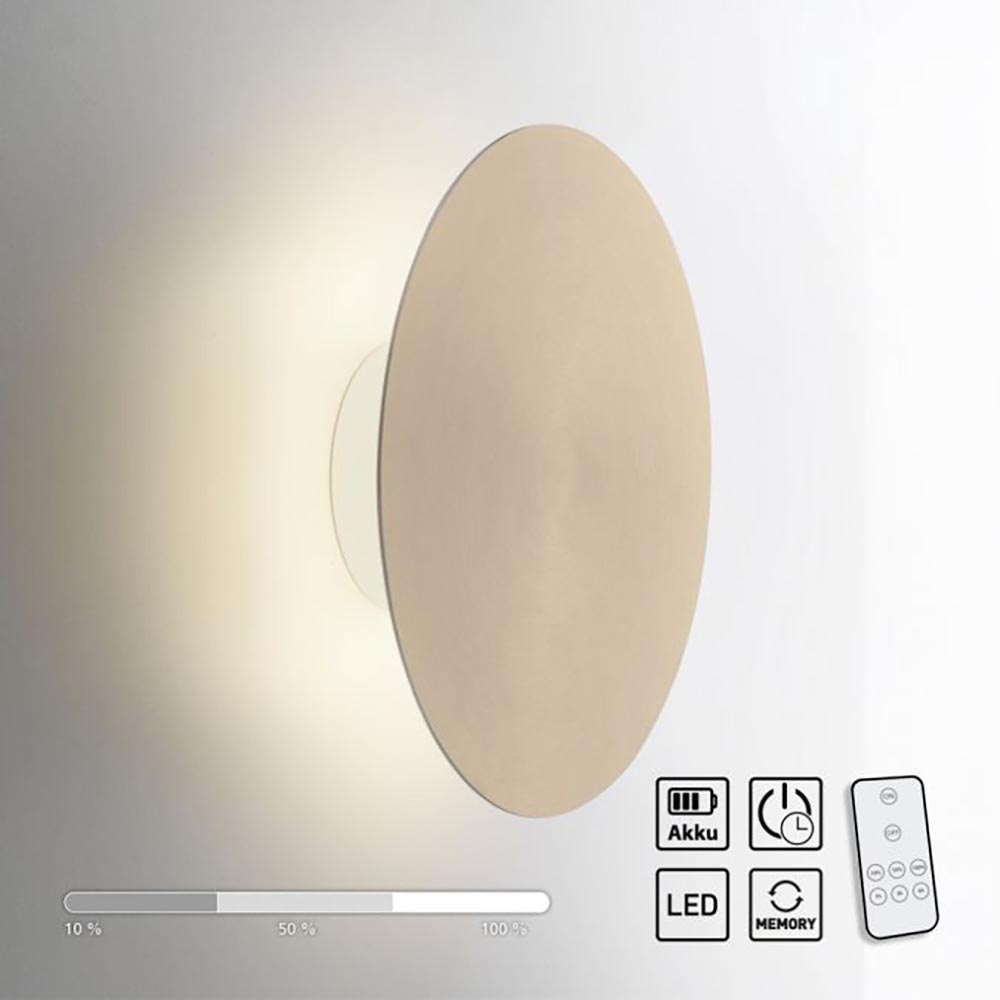 Deze moderne wandlamp is een verrijking voor het interieur. De LED wandlamp is zowel functioneel als effectief en is gemakkelijk is diverse ruimtes te gebruiken. De wandlamp werkt namelijk op een accu en is daardoor overal op te hangen. De ronde wandlamp is gemakkelijk te verwijderen van de wandbeugel zodat deze weer kan worden opgeladen met de meegeleverde USB kabel. De plaat op de wandlamp is uitgevoerd in het goud waarbij de verlichting aan de achterzijde is gemonteerd. Dit zorgt voor een sfeervol effect op de ondergrond. De LED lamp is in 3-standen te dimmen en is voorzien van een timerfunctie. De accu wandlamp heeft een accuduur van 7-40 uur en is gemakkelijk te bedienen met de meegeleverde afstandsbediening.