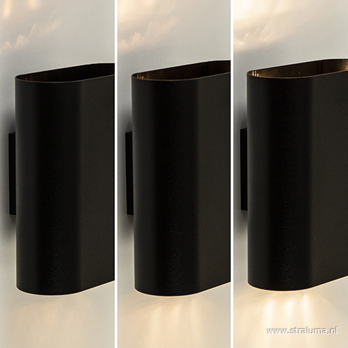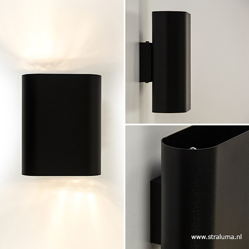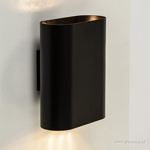 Mooie strakke design wandlamp uitgevoerd in metaal en mat zwart gespoten. De binnenkant is ook zwart waardoor het licht een mooie warme gloed krijgt. Deze zwarte wandlamp geeft licht naar boven en naar beneden langs de muur. In deze ovale wandlamp kunt u led- of spaarlampen gebruiken, dus deze muurlamp is energiezuinig en kunt u dus gerust de hele avond laten branden. Mooi voor sfeer en ruimte in uw huis, want wist u dat wandlampen ervoor zorgen dat uw kamer er optisch groter door lijkt.