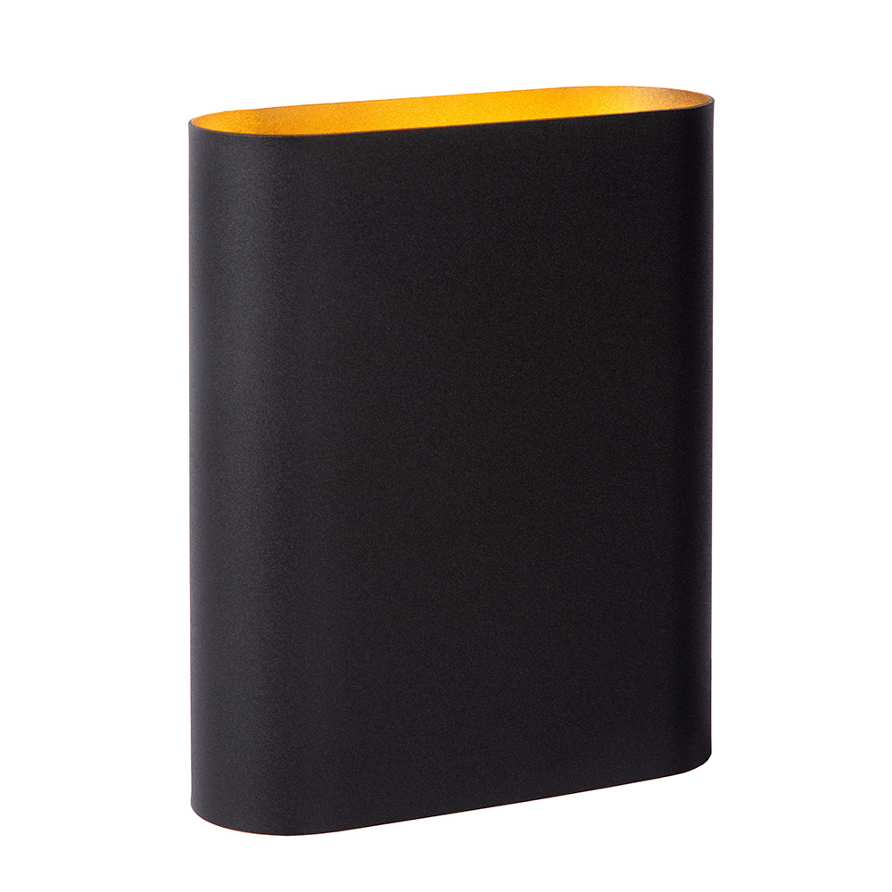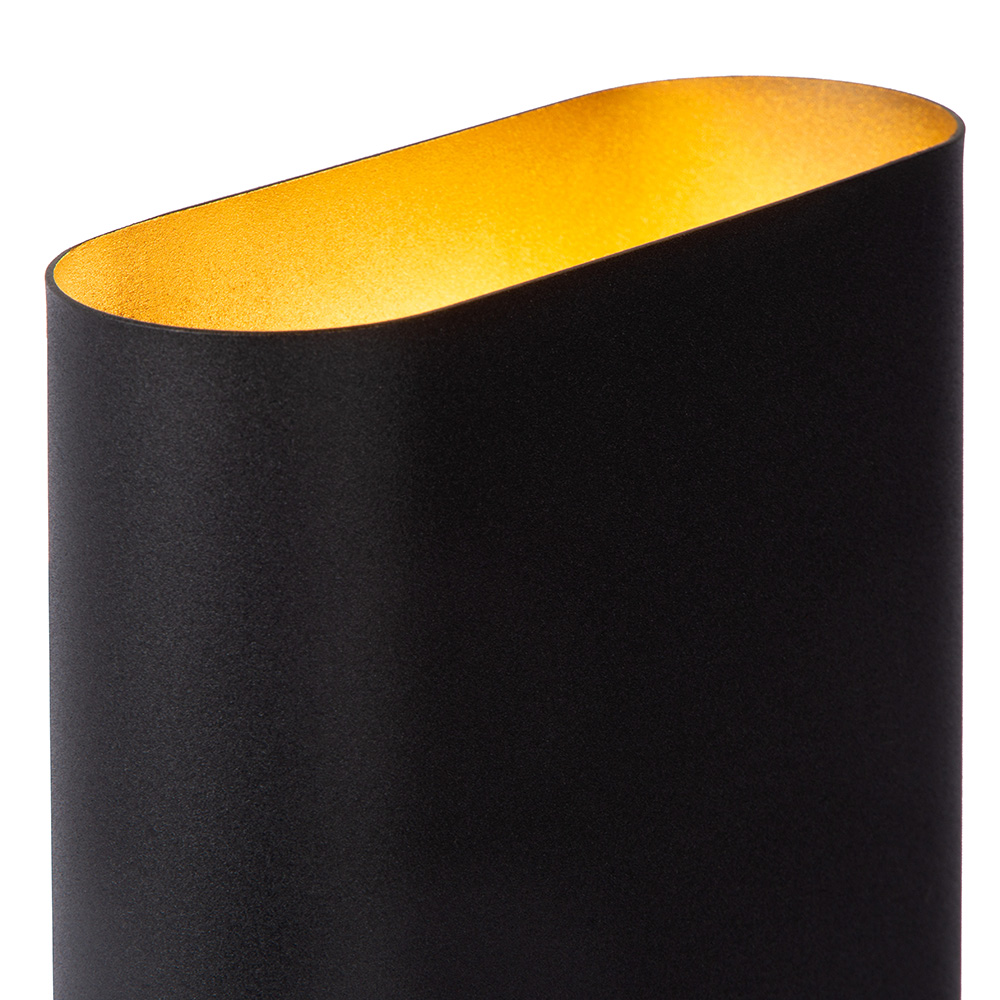 Wandlamp met een mooi strak design, uitgevoerd in een mat zwarte kleur met een goud gespoten binnenkant. De goude binnenkant geeft het licht een mooie warme gloed. Deze zwarte wandlamp geeft licht naar boven en naar beneden langs de muur doormiddel van 2 led- of spaarlampen met een E14 fitting. Hierdoor is deze lamp energiezuinig. U kunt hem dan ook gerust de hele avond laten branden. Mooi om sfeer en warmte in uw huis te creëren. Wist u dat wandlampen ervoor zorgen dat uw kamer optisch groter lijkt.