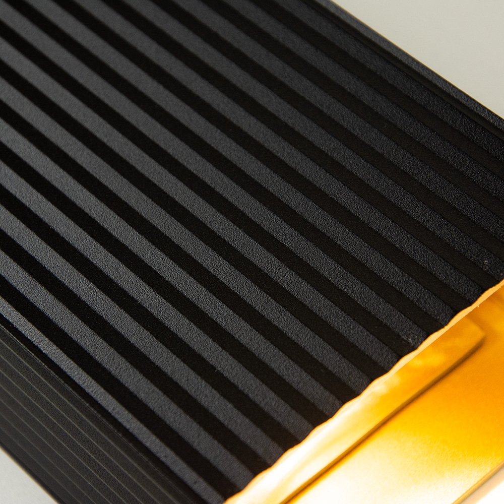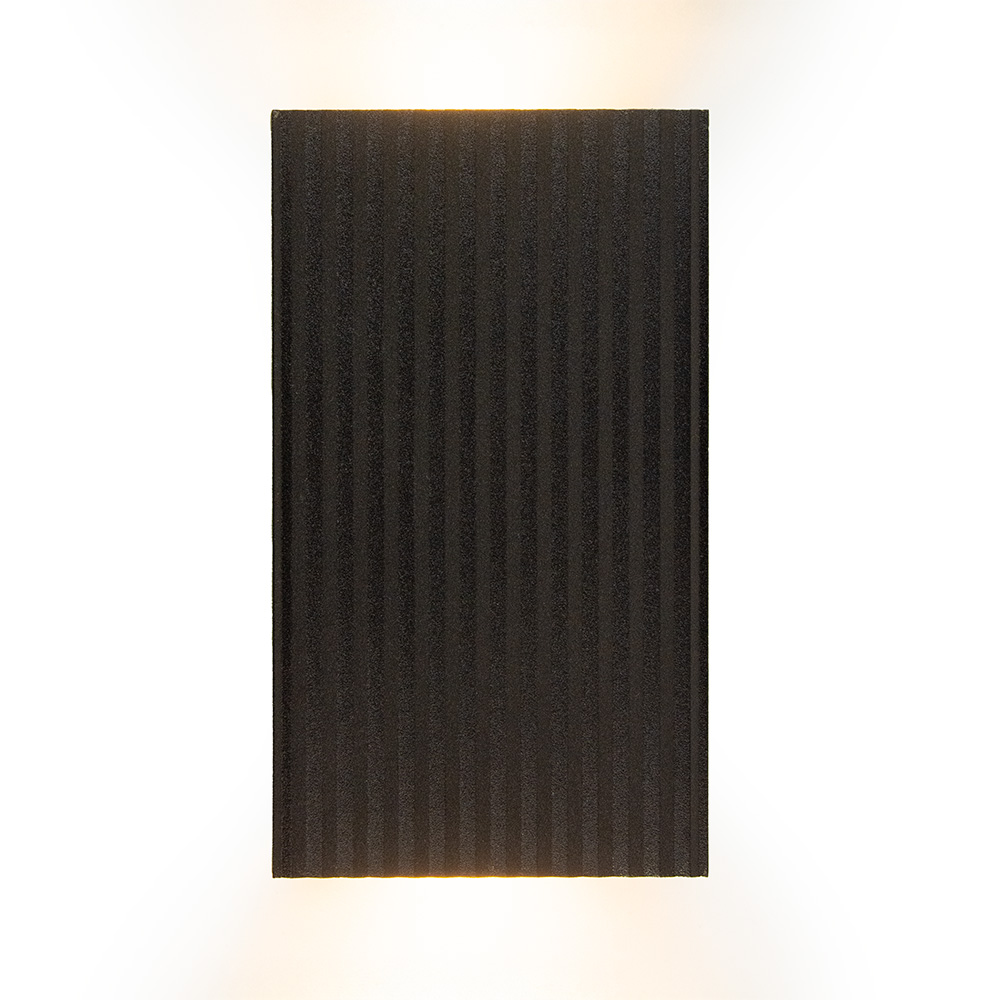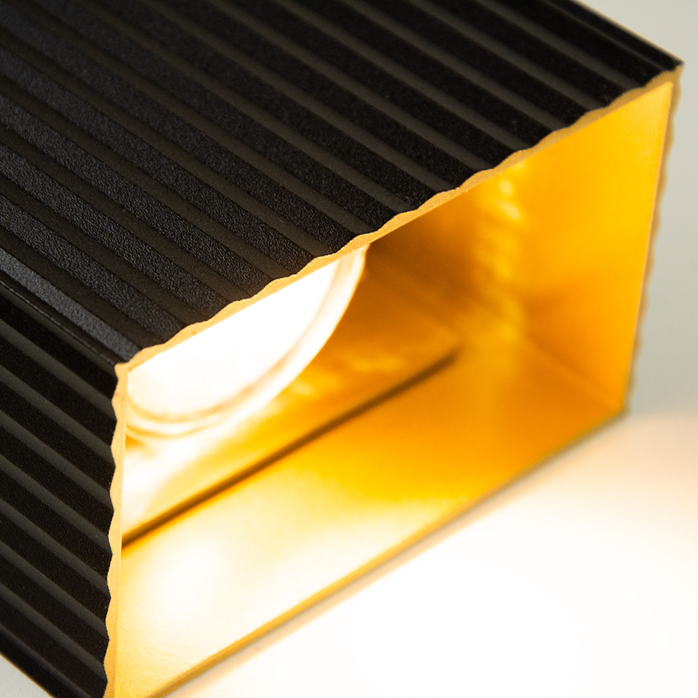 De nieuwste aanwinst onder onze wandlampen. Deze mooie sfeermaker is uitgevoerd in aluminium, kleur zwart met goud en voorzien van een ribbel. Dit geeft een heel mooi chique effect. Geschikt voor in de hal, woonkamer of slaapkamer. De wandlamp is klein van stuk maar zorgt voor een groot effect in de ruimte. De rechthoekige wandlamp werkt namelijk als een up en downlighter. De wandlamp is van binnen voorzien van 2 GU10 fittingen. Dit zorgt voor een sfeervol zandloper effect op de wand. De wandlamp is niet voorzien van een snoer en wordt geleverd exclusief lichtbron. De wandplaat kan eenvoudig los worden gemonteerd op de muur waarna de rechthoekige kap eroverheen kan worden geschoven.