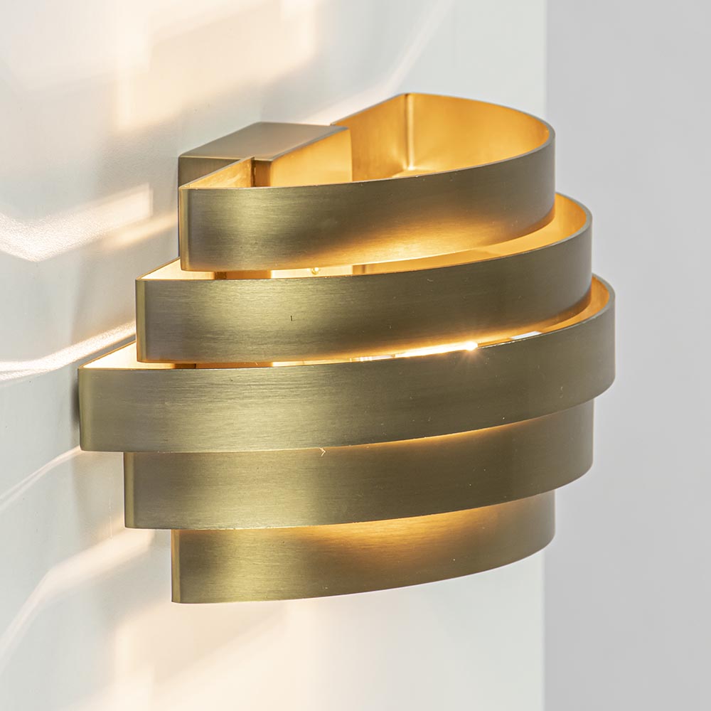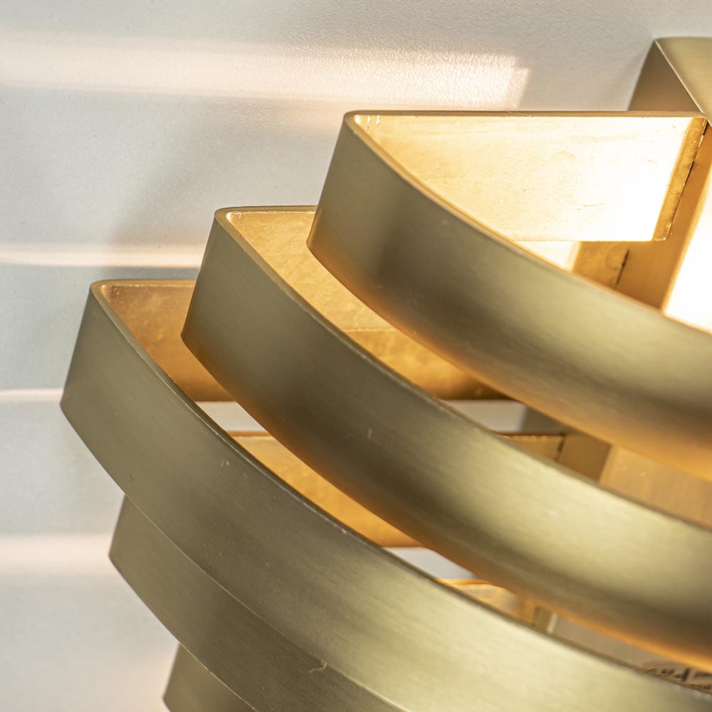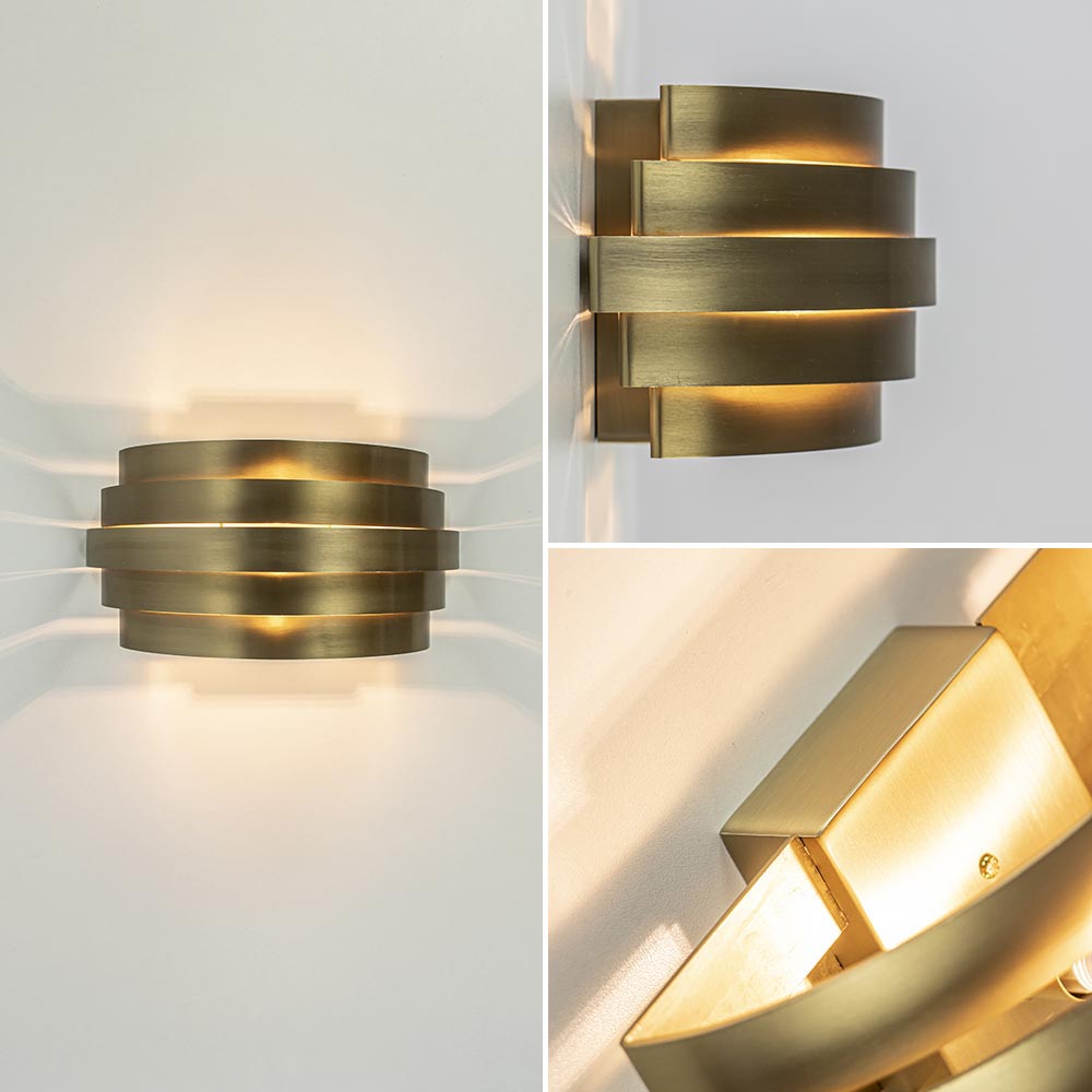 Deze wandlamp is een mooie toevoeging aan een hal, woonkamer of slaapkamer. De half ronde wandlamp is gemaakt van metalen stroken die elkaar in breedte afwisselen. Dit zorgt ervoor dat de wandlamp een open constructie krijgt waar het licht mooi doorheen kan schijnen. Zo wordt het licht mooi in een zandloper effect op de wand verspreid en daarnaast ook lichtjes aan de zijkant. Het metaal is uitgevoerd in het goud wat de lamp zowel en trendy als klassieke uitstraling geeft. De wandlamp is dimbaar dmv een externe dimmer en wordt geleverd zonder lichtbron (G9).