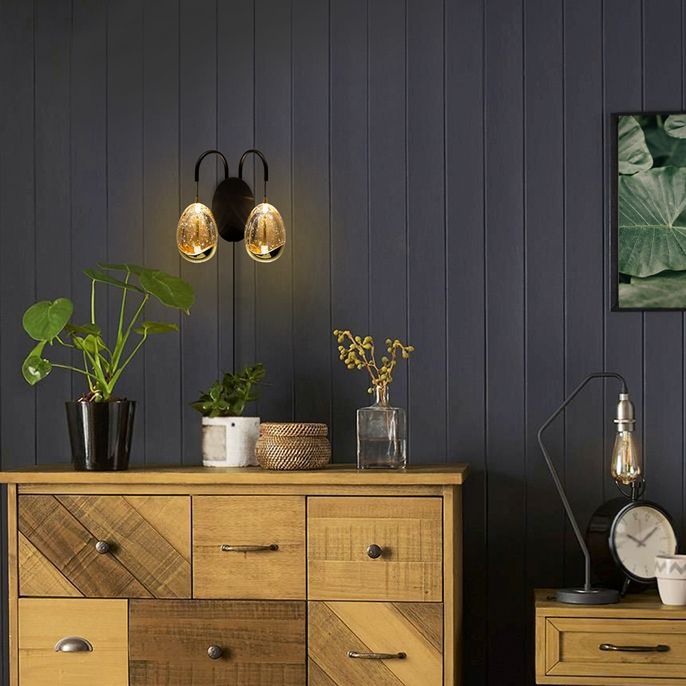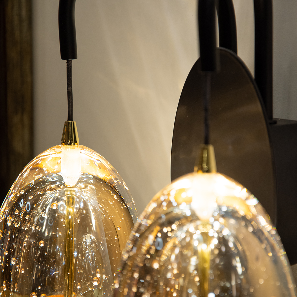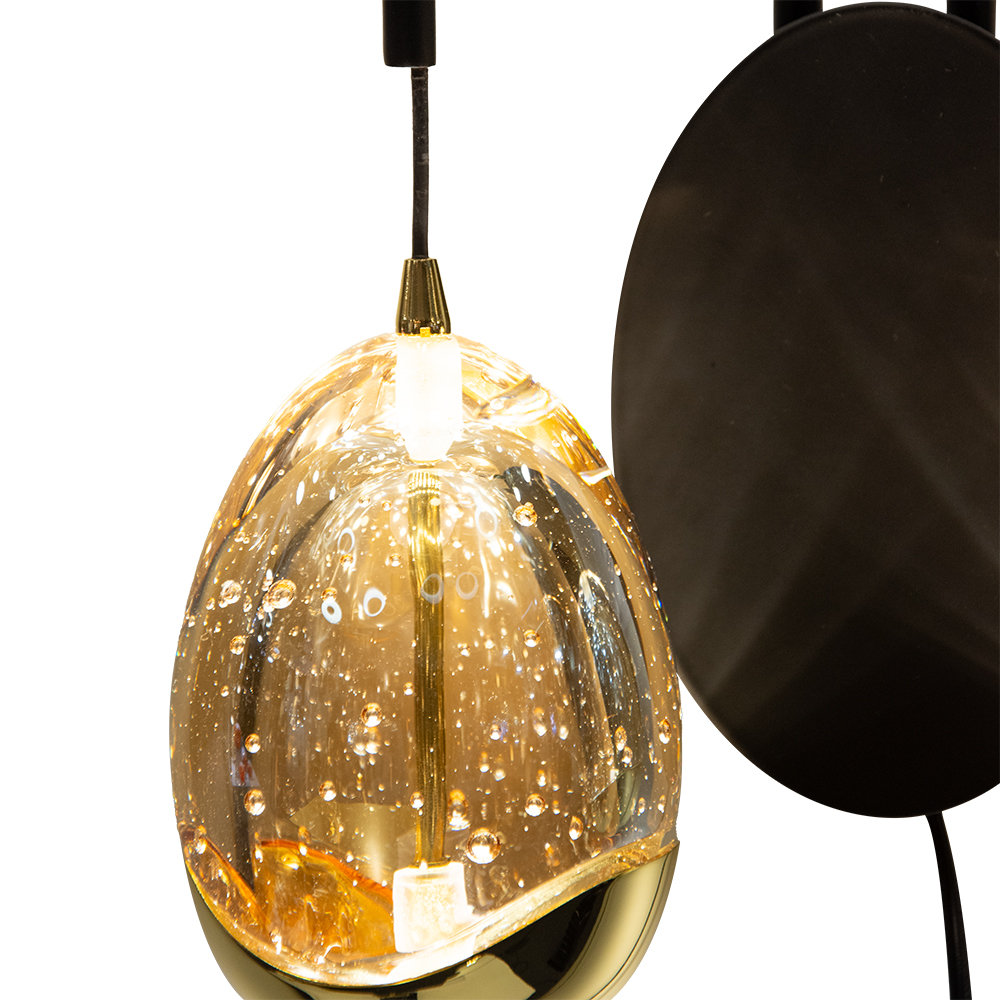 De Golden Egg wandlamp is een elegante blikvanger die sfeer en luxe toevoegt aan elke ruimte. De 2 hangende lichtpunten, elk in de vorm van een elegant goud ei, zijn vervaardigd uit mondgeblazen glas met een subtiele bubbelstructuur, wat zorgt voor een prachtig sprankelend lichteffect. De zwarte, ovale wandplaat vormt een stijlvol contrast met het gouden glas en maakt deze wandlamp perfect voor moderne, chique en hotelwaardige interieurs. Ideaal voor naast het bed, in de hal of als sfeervolle accentverlichting in de woonkamer.