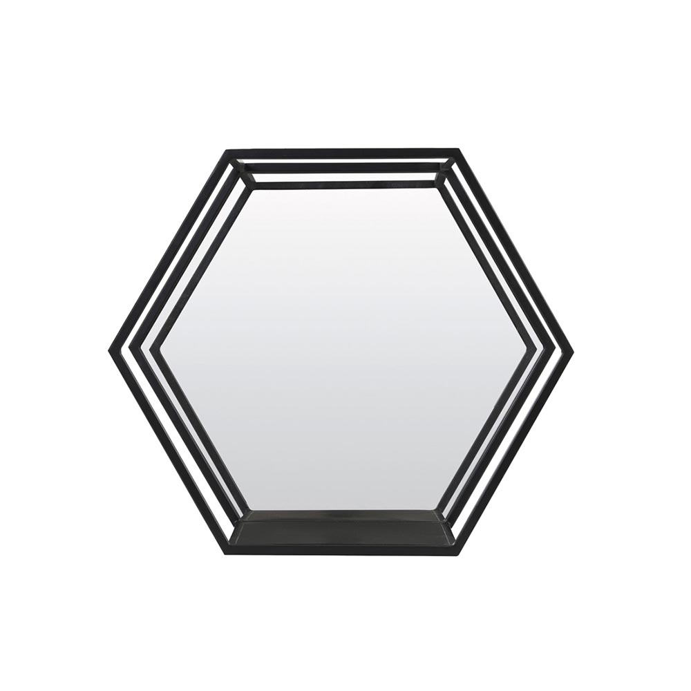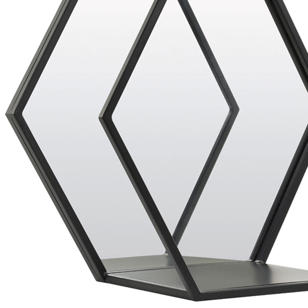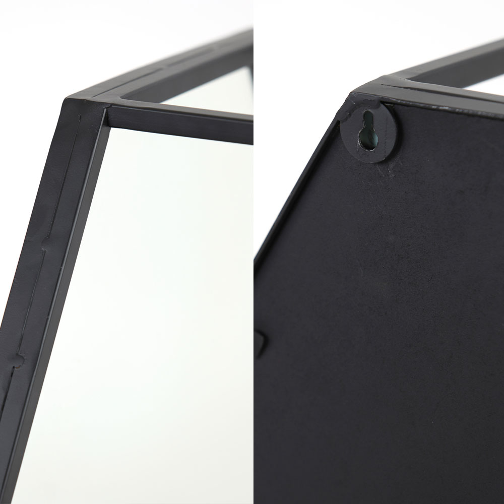 Deze bijzondere spiegel is een zeshoekig wandrek met een spiegel in de achterwand. Deze combinatie is ideaal in de hal of gang, want even snel je haar checken en je sleutels kwijt kan allemaal met deze wandplank-spiegel. Gemaakt van metaal is deze spiegel door het lijnenspel perfect geschikt in het moderne, Scandinavische interieur. Dit wandrek met spiegel is ook verkrijgbaar in een maatje groter!
