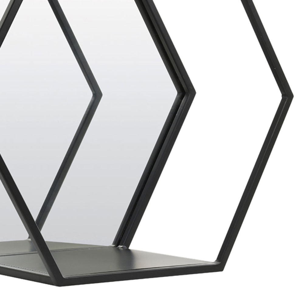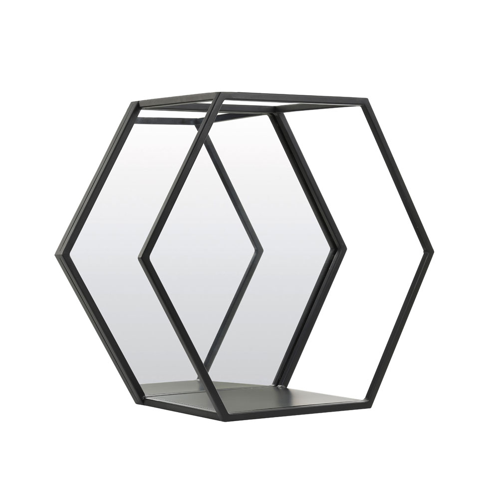 Deze bijzondere spiegel is een zeshoekig wandrek met een spiegel in de achterwand. Deze combinatie is ideaal in de hal of gang, want even snel je haar checken en je sleutels kwijt kan allemaal met deze wandplank-spiegel. Gemaakt van metaal is deze spiegel door het lijnenspel perfect geschikt in het moderne, Scandinavische interieur. Dit wandrek met spiegel is ook verkrijgbaar in een maatje kleiner!