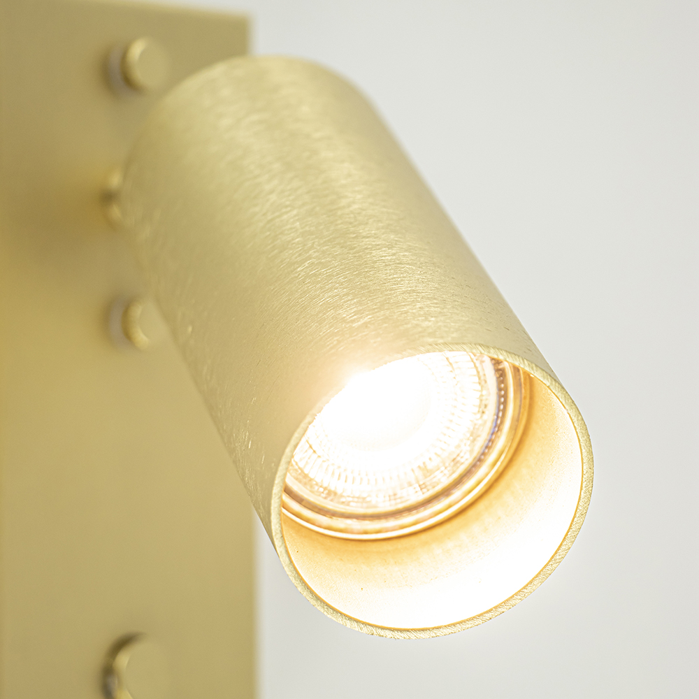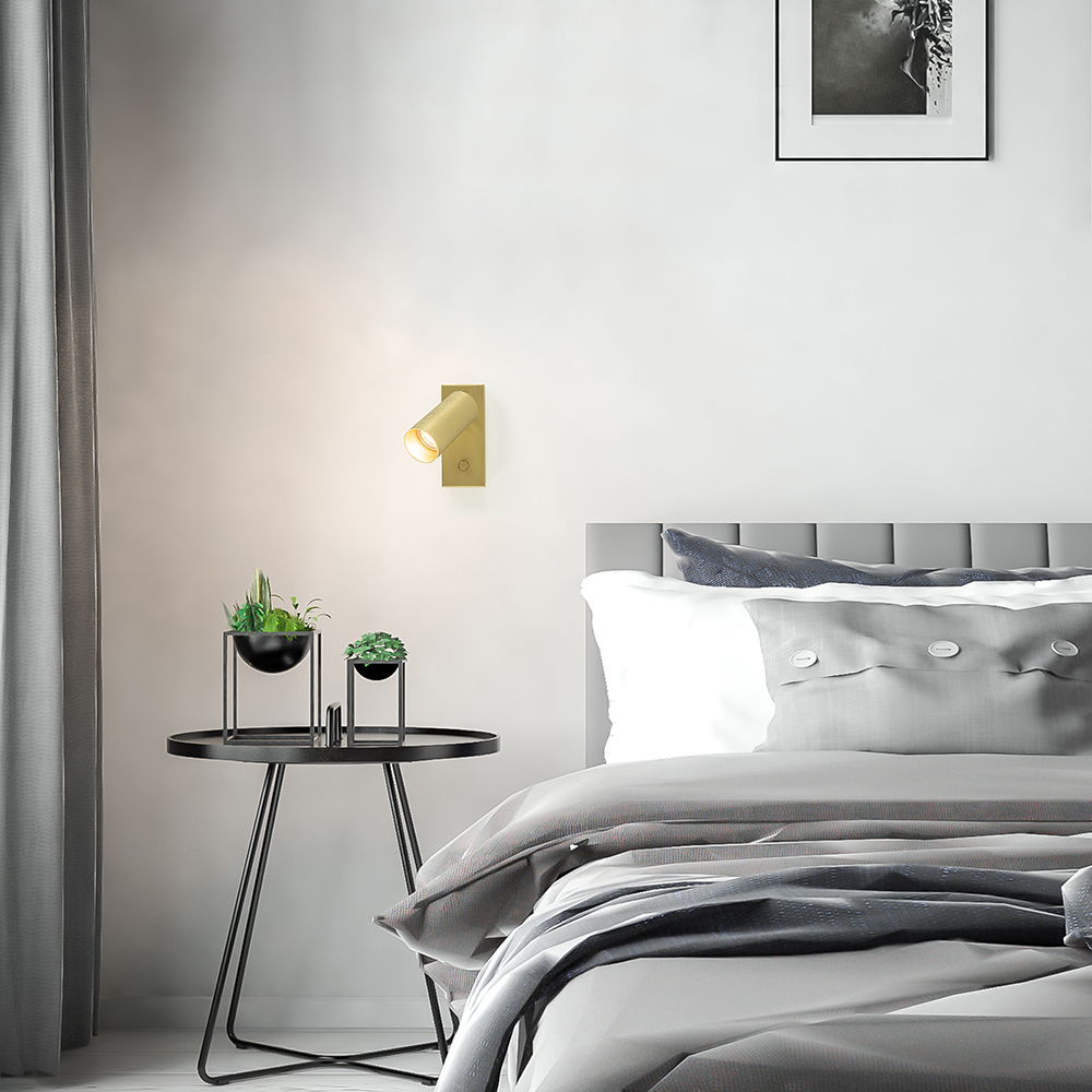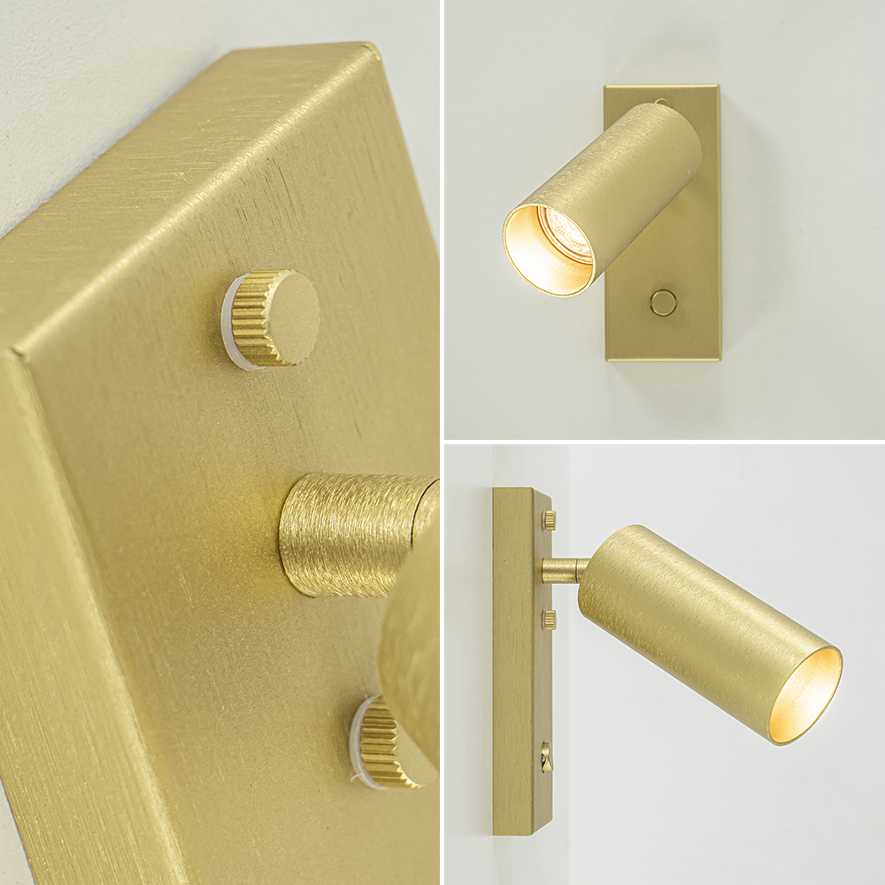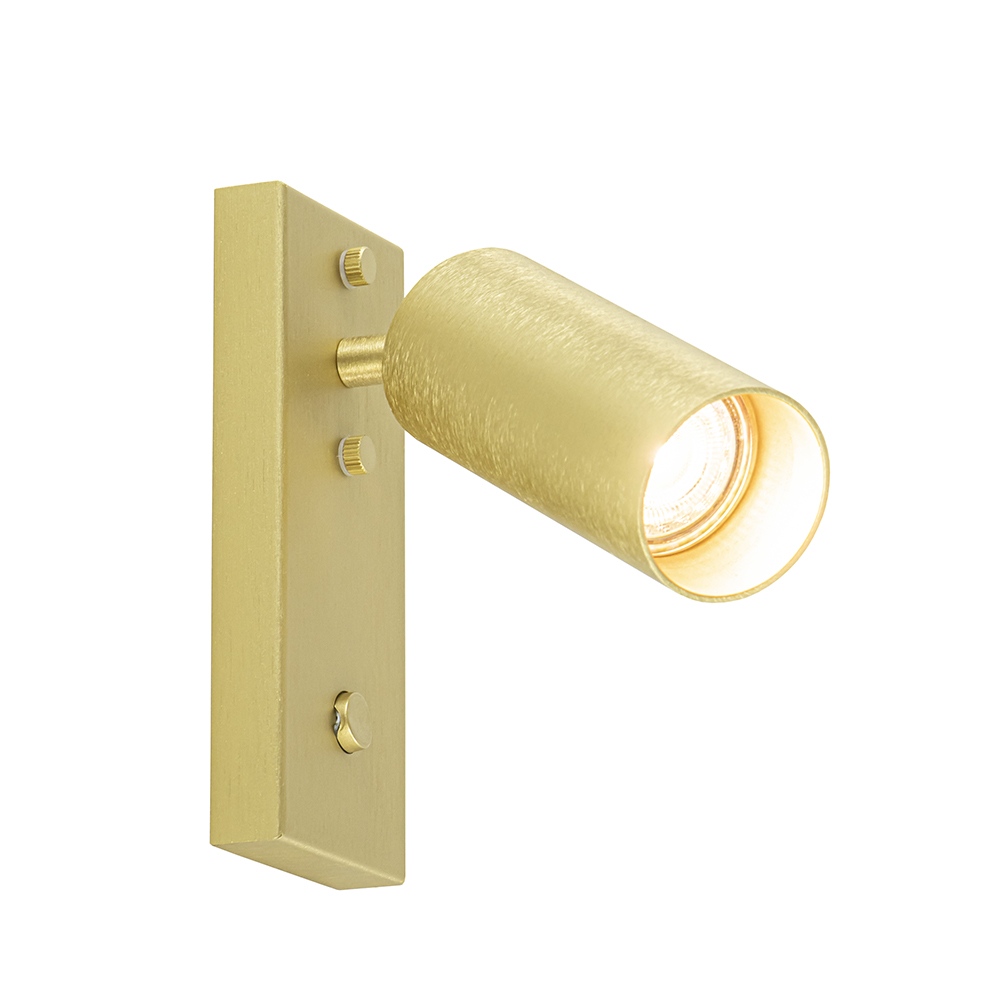 Deze prachtige wandlamp is een perfecte toevoeging aan het interieur. Ideaal voor bij het bed of naast de bank. De wandamp is volledig van metaal en uitgevoerd in het messing. Het staal heeft een luxe afwerking en als detail een gouden binnenzijde. De rechthoekige wandplaat is voorzien van 2 schroefjes om de lamp op de wand vast te maken en van een schakelaar om de lamp gemakkelijk te bedienen. Geen los draad dat in de weg hangt maar een strakke afwerking. De cilinder vormige spot is naar wens te verstellen door deze te draaien en/of kantelen. Ideaal om zo de gewenste richting te bepalen. De moderne wandlamp is dimbaar middels een externe dimmer en wordt geleverd exclusief lichtbron.