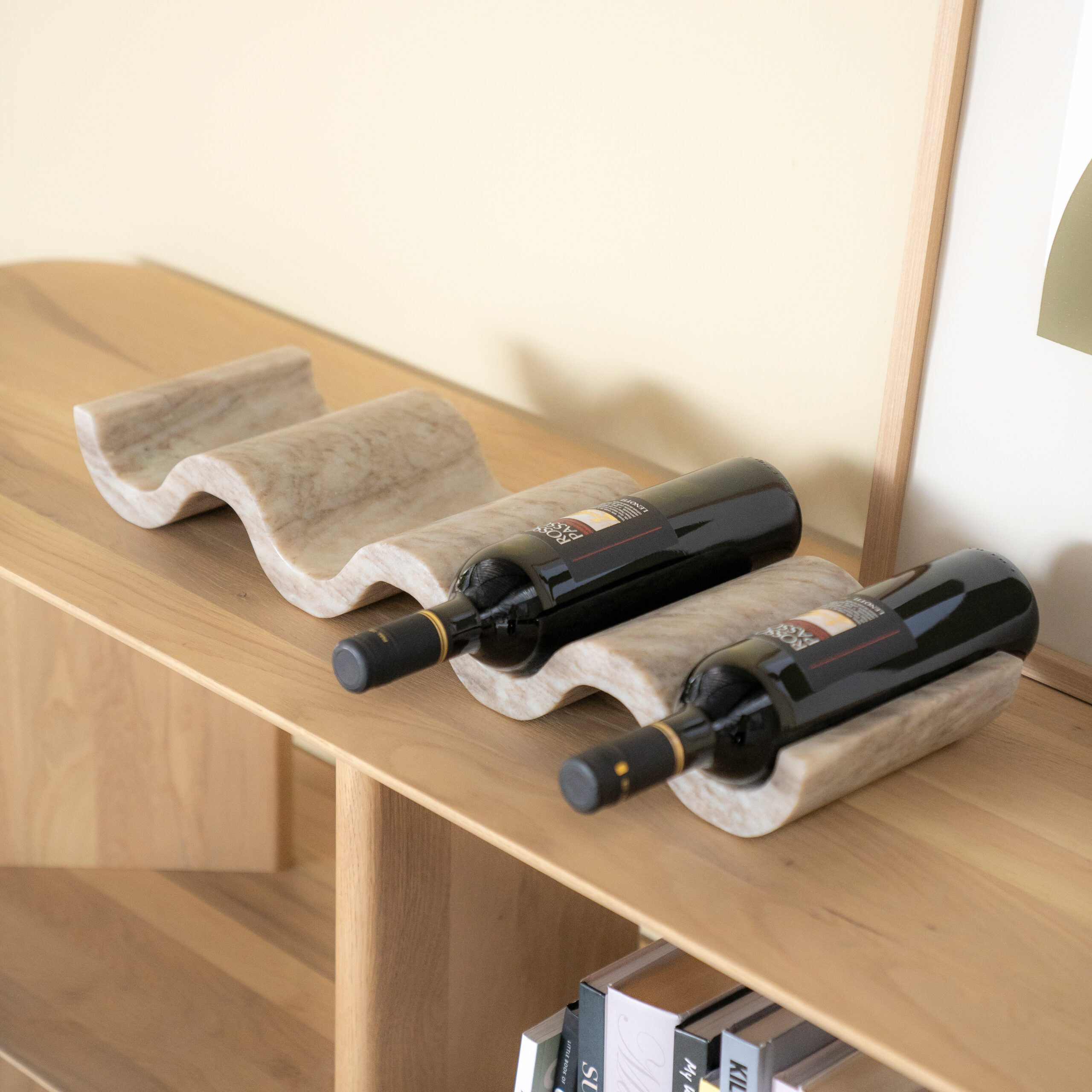 Korte omschrijving Een elegant en sculpturaal wijnrek van marmer met golvend design, perfect voor het stijlvol presenteren van je favoriete flessen.