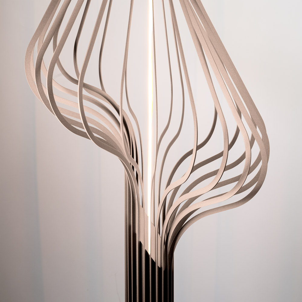 Highlights • Uniek sculpturaal design met organische lijnen • Verkrijgbaar in twee luxe kleuren: Quartz en Platinum • Inclusief exclusieve Segula LED-lichtbron (vervangbaar artikel 0408622) • Sfeervol licht met speels lijnenspel en schaduwvorming • Dimbaar via voetdimmer (vloerschakelaar) • Perfect naast een fauteuil of als statement in de woonkamer