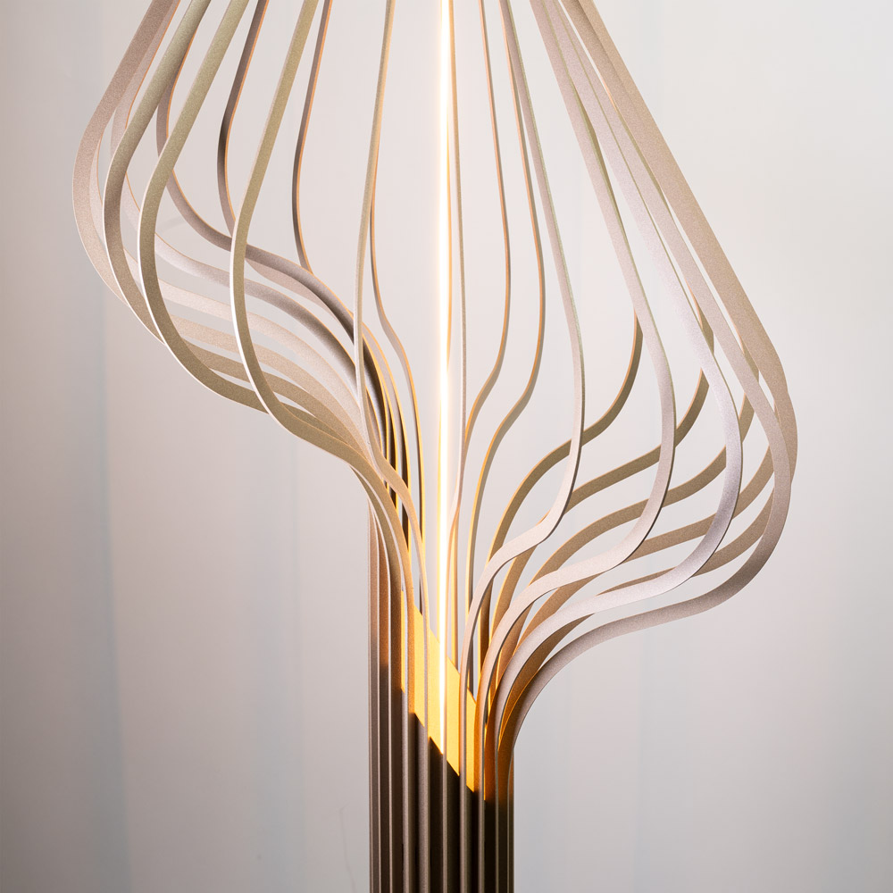 Highlights • Uniek sculpturaal design met organische lijnen • Verkrijgbaar in twee luxe kleuren: Quartz en Platinum • Inclusief exclusieve Segula LED-lichtbron (vervangbaar artikel 0408622) • Sfeervol licht met speels lijnenspel en schaduwvorming • Dimbaar via voetdimmer (vloerschakelaar) • Perfect naast een fauteuil of als statement in de woonkamer