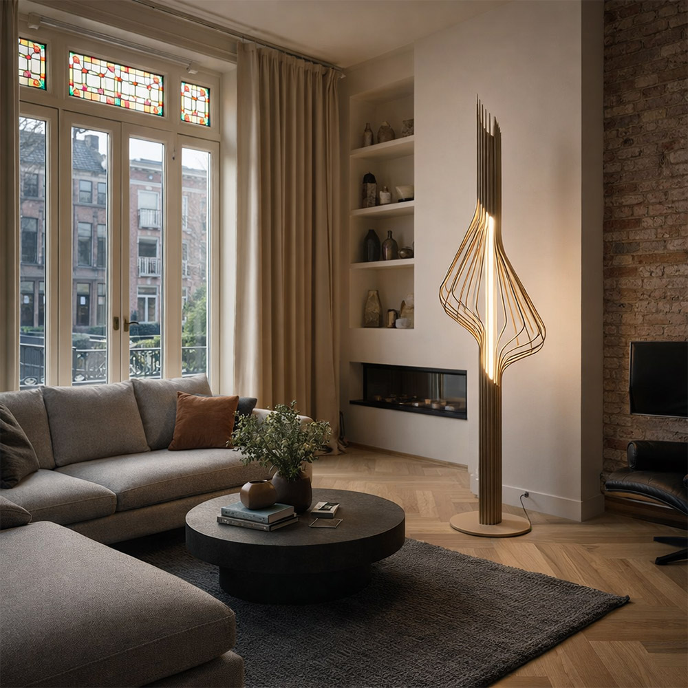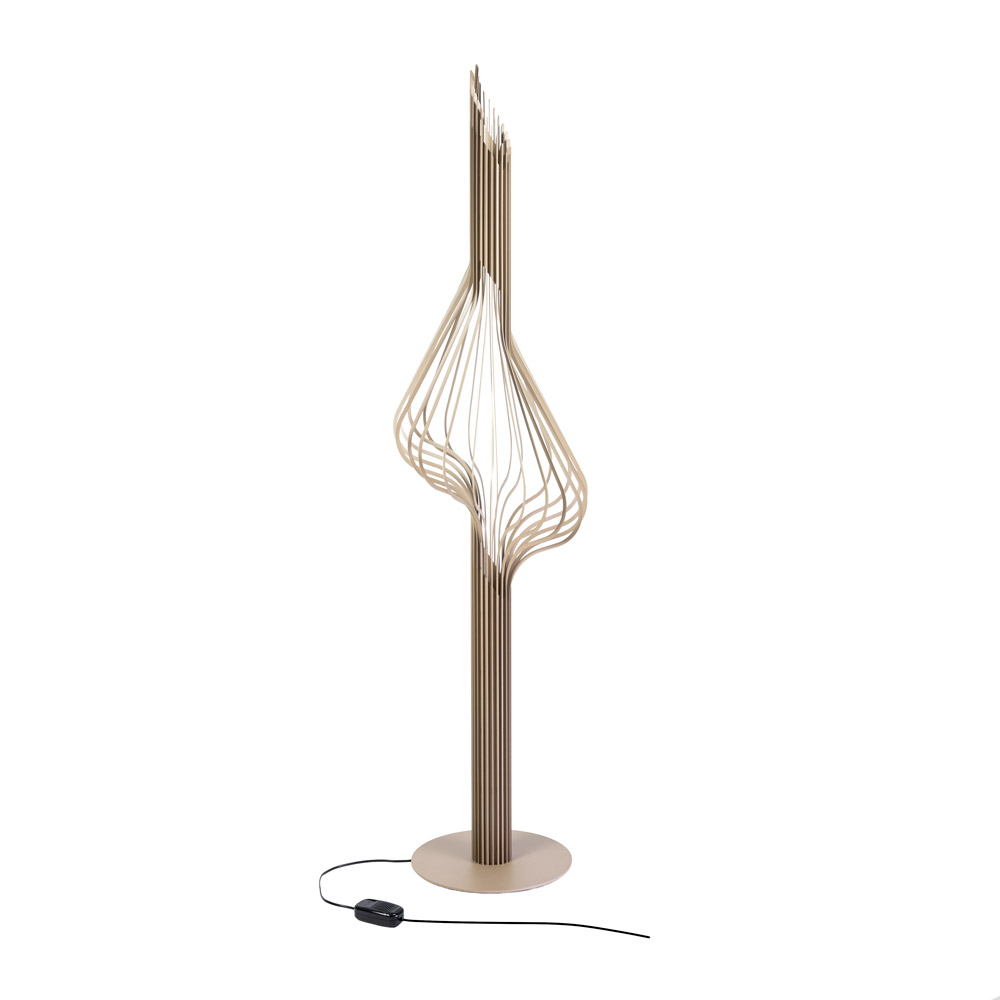 De Elba vloerlamp van Ztahl is een echte blikvanger waarin design en verlichting naadloos samenkomen. Het open, organische frame bestaat uit elegante metalen lijnen die zich rondom de centrale lichtbron vormen. Dit zorgt voor een bijzonder lichtspel en een warme, sfeervolle uitstraling in de ruimte.