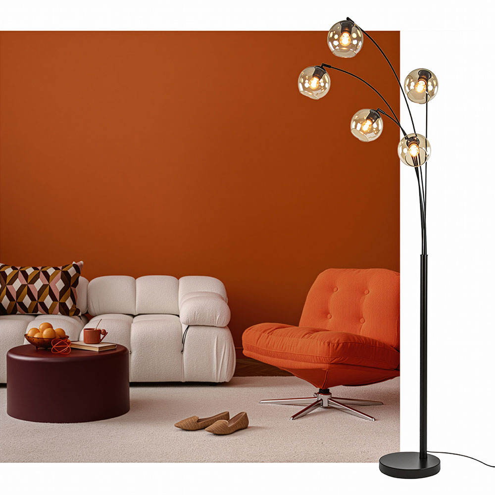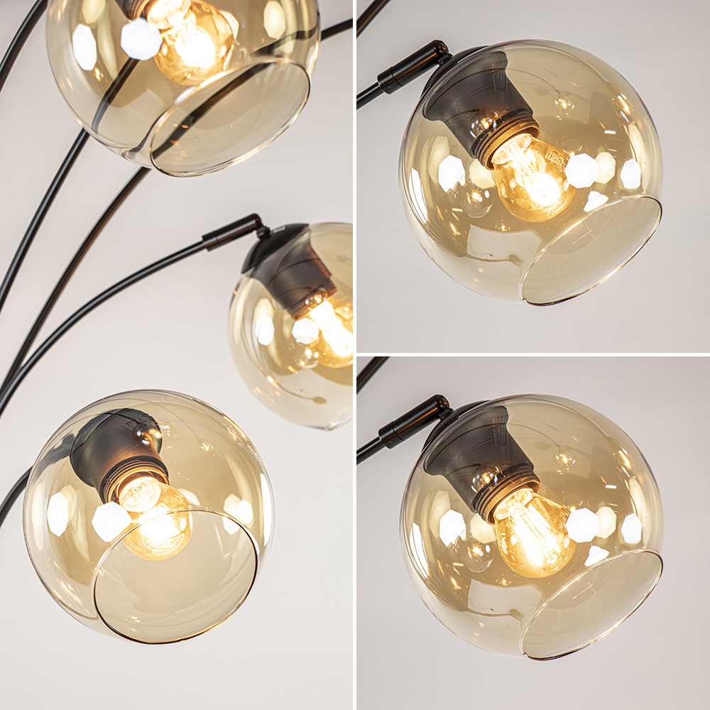 Deze moderne vloerlamp is een echte eyecatcher voor naast de bank of in een donkere hoek van de kamer. Het mat zwarte armatuur met vijf verstelbare armen geeft de lamp een luxe en eigentijdse uitstraling. Elke arm is voorzien van een amberkleurige glazen bol die kan kantelen en draaien, zodat je het licht volledig naar wens kunt richten. Bundel de armen bij elkaar voor een rustige look of spreid ze juist voor een speels effect.